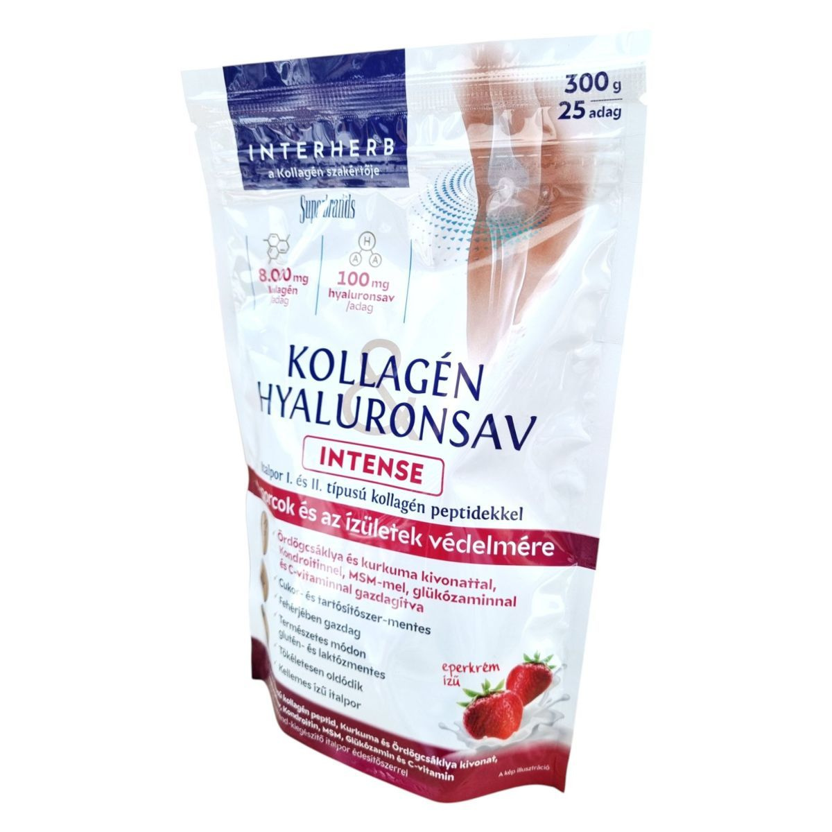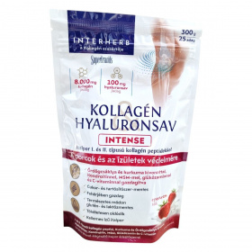 Az INTERHERB KOLLAGÉN HYALURONSAV INTENSE italpor egy eperkrém ízű étrend-kiegészítő, amely I. és II. típusú kollagén peptideket, hyaluronsavat, valamint kurkuma és ördögcsáklya kivonatot tartalmaz. A termék célja, hogy támogassa a porcok és ízületek védelmét, különösen a kor előrehaladtával vagy fokozott fizikai aktivitás esetén. A C-vitamin hozzájárulhat a normál kollagénképződéshez, míg a kurkuma és az ördögcsáklya segíthet az ízületek mozgékonyságának és rugalmasságának megőrzésében. A termék fehérjében gazdag, természetes módon glutén- és laktózmentes, valamint cukor- és tartósítószer-mentes. Az italpor könnyen oldódik, és kellemes ízű, így egyszerűen beilleszthető a mindennapi étrendbe.