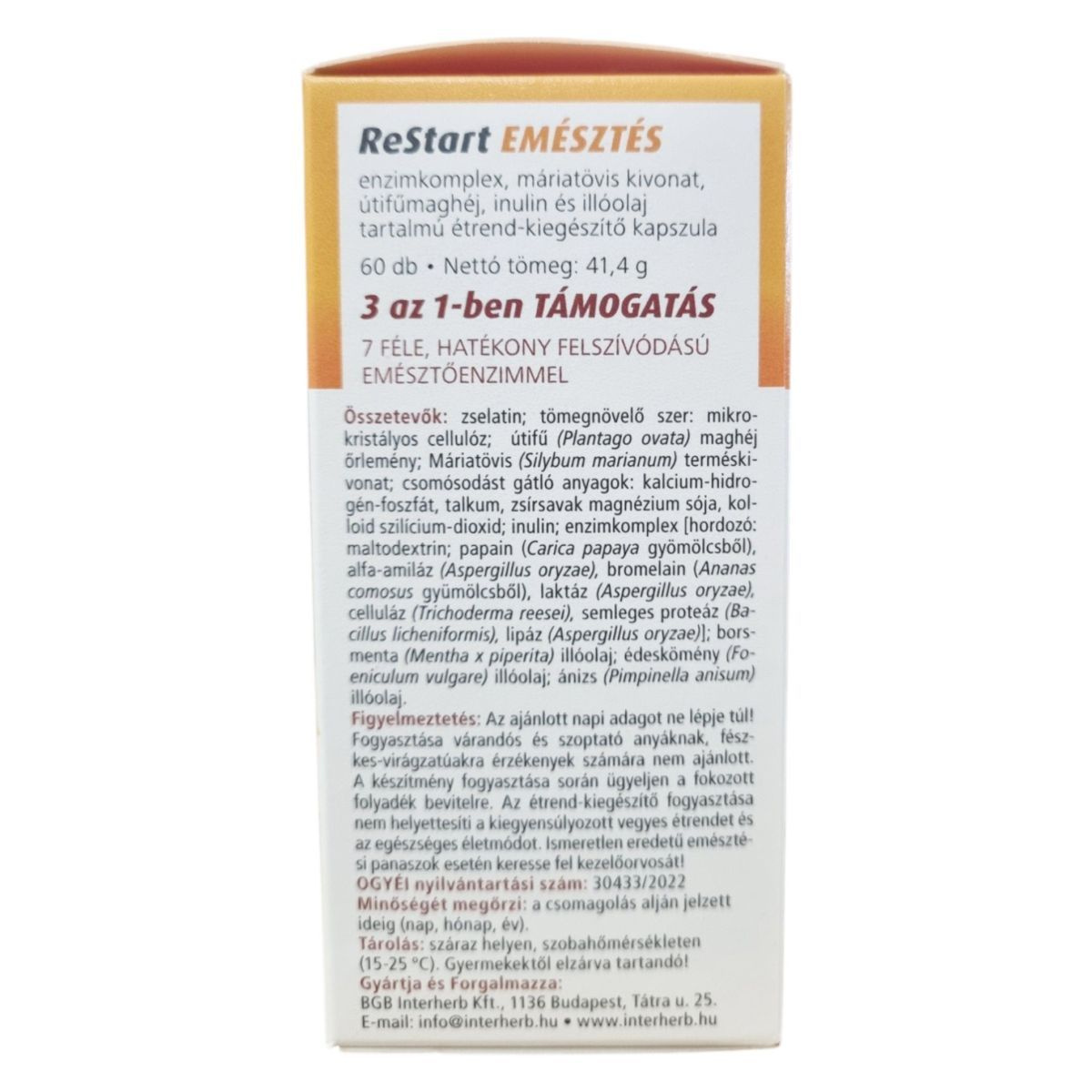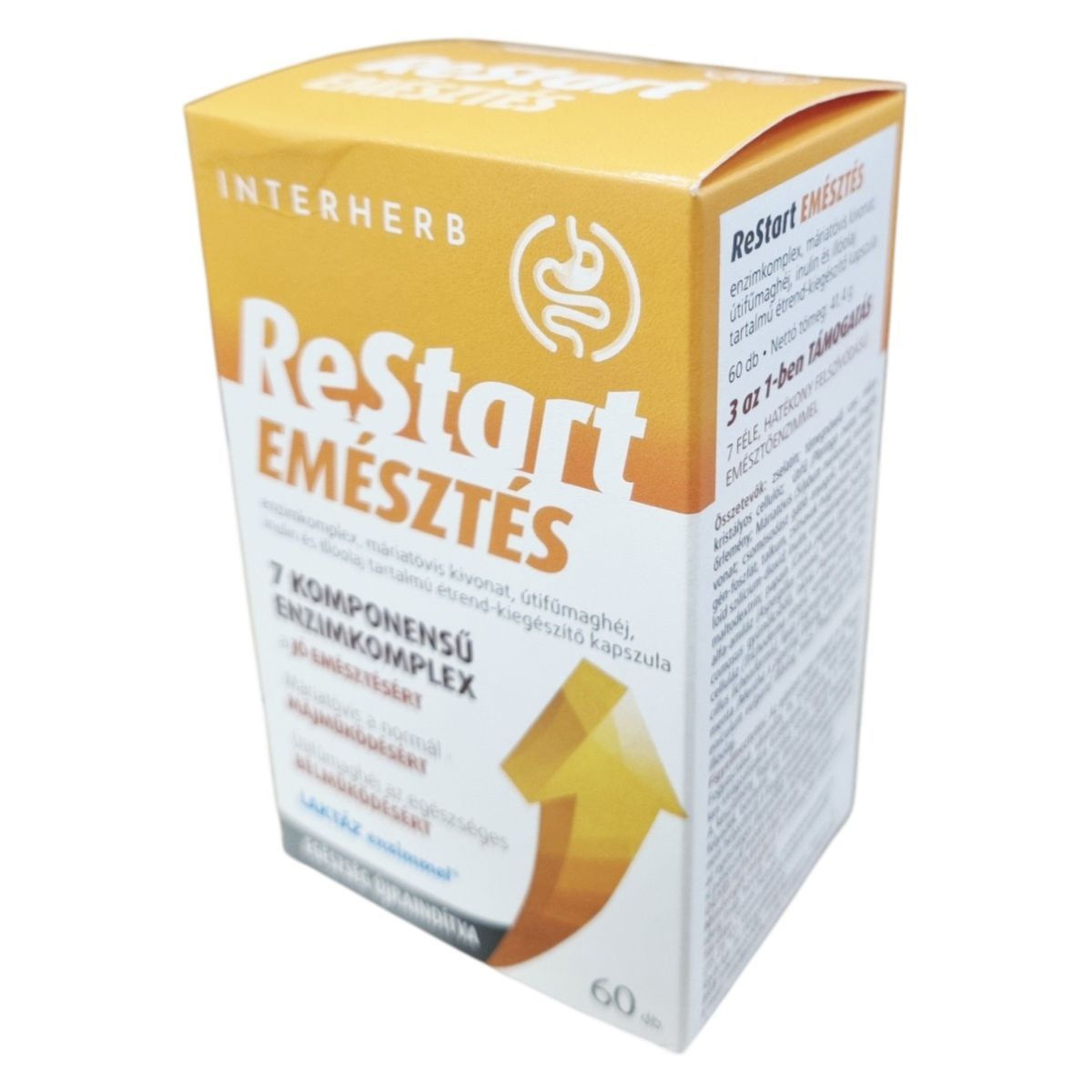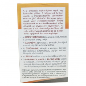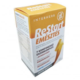 Az INTERHERB ReStart EMÉSZTÉS kapszula enzimkomplexet, máriatövis kivonatot, útifűmaghéjat, inulint és illóolajokat tartalmazhat, amelyek hozzájárulhatnak az emésztés támogatásához és a normál májműködés fenntartásához.