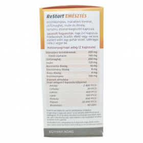 A ReStart EMÉSZTÉS kapszula célja, hogy támogassa az emésztést és a májműködést. A termék 7 komponensű enzimkomplexet tartalmaz, amely segíthet a zsírok, fehérjék és szénhidrátok anyagcseréjében. A máriatövis hozzájárulhat a normál májműködés fenntartásához, míg az útifűmaghéj elősegítheti a rendszeres bélműködést. Az inulin kiegészítheti a napi rostbevitelt, míg a borsmenta, ánizs és édeskömény illóolajok a gyomorműködést támogathatják. A termék különösen ajánlott azok számára, akik aktív életmódot folytatnak, és fontosnak tartják az emésztőrendszeri komfort fenntartását.
