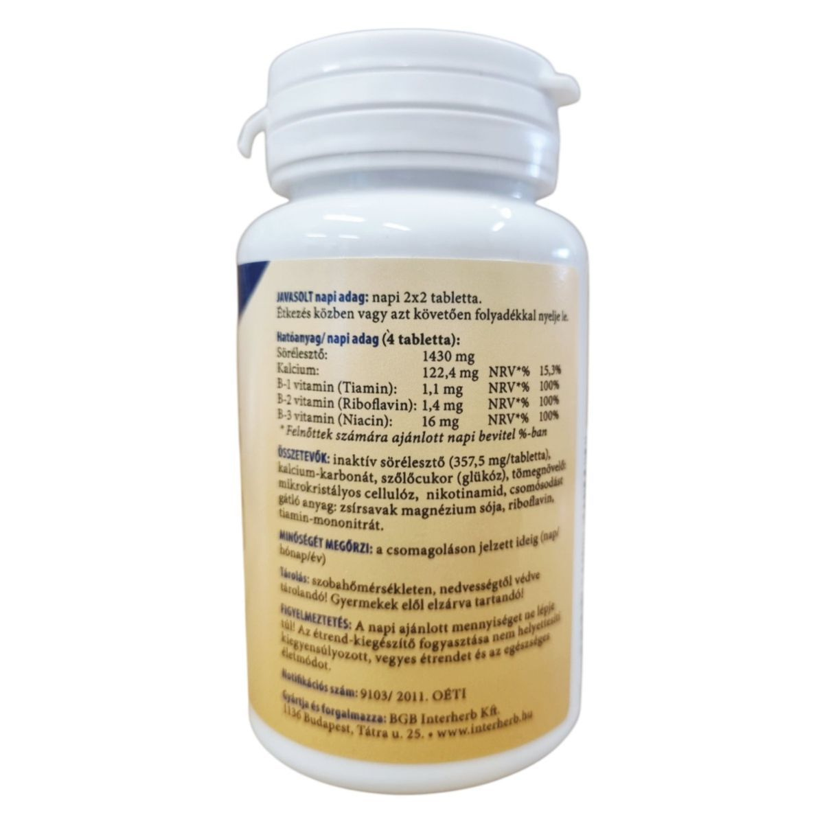 Inaktív sörélesztő (357,5 mg/tabletta), kalcium-karbonát, szőlőcukor (glükóz), tömegnövelő: mikrokristályos cellulóz, niacinamid, csomósodást gátló anyag: zsírsavak magnézium sója, riboflavin, tiamin-mononitrát.