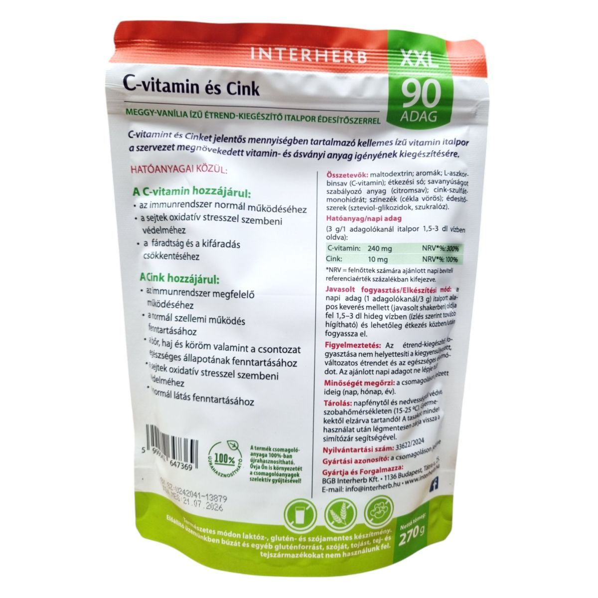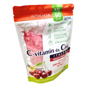 Az INTERHERB C-vitamin és Cink italpor egy meggy-vanília ízű étrend-kiegészítő, amelyet a szervezet megnövekedett vitamin- és ásványi anyag igényének kiegészítésére fejlesztettek ki. A termék jelentős mennyiségű C-vitamint és cinket tartalmaz, amelyek hozzájárulhatnak az immunrendszer normál működéséhez, a sejtek oxidatív stresszel szembeni védelméhez, valamint a fáradtság és kifáradás csökkentéséhez. A cink ezen felül támogathatja a normál szellemi működést, a bőr, haj és köröm egészséges állapotának fenntartását, valamint a normál látás fenntartását is. A termék 270 g-os kiszerelésben kapható, és 90 adag elkészítésére elegendő. A csomagolás 100%-ban újrahasznosítható, így környezetbarát választás lehet.