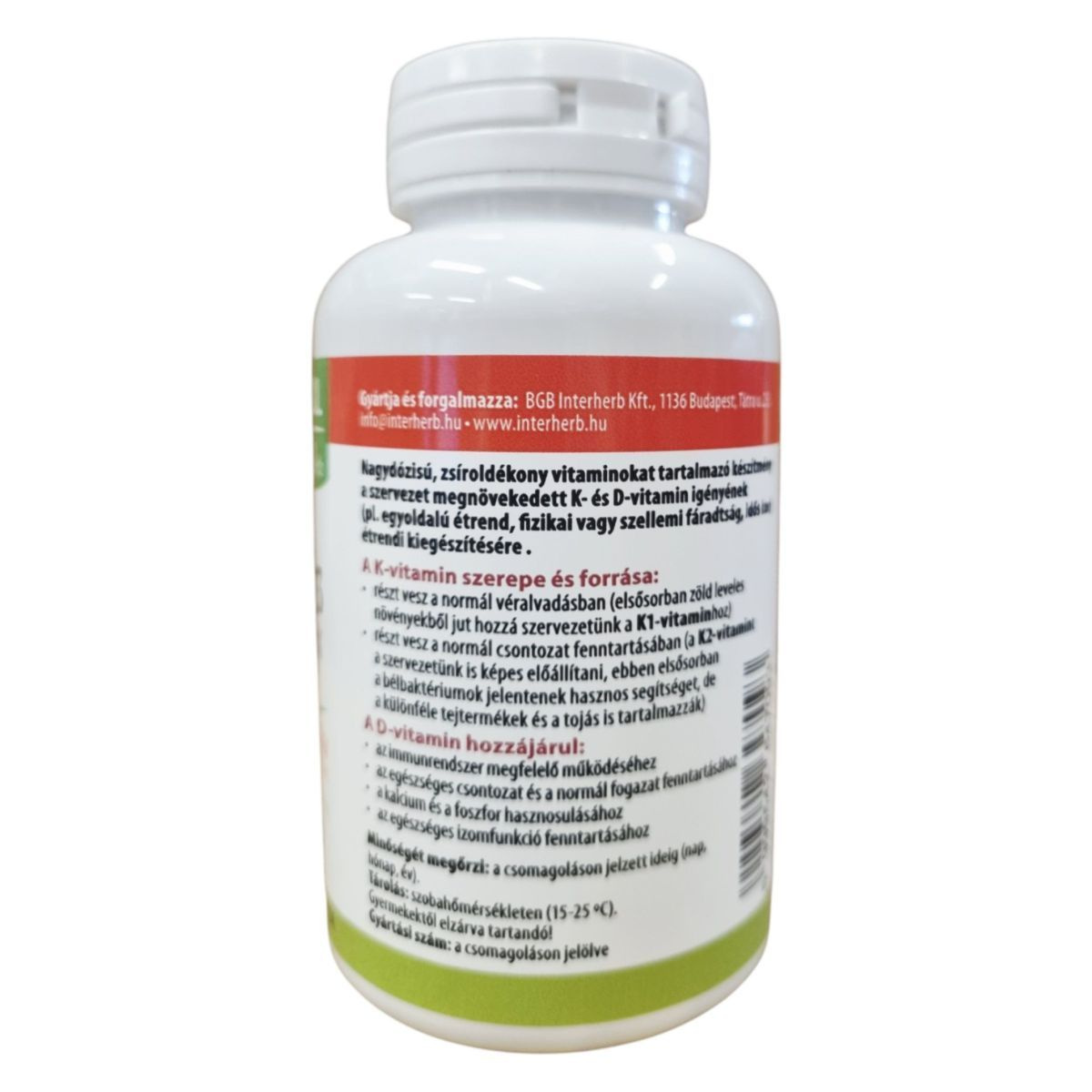 Az INTERHERB K1+K2+D3 VITAMIN KOMPLEX egy étrend-kiegészítő tabletta, amely nagy dózisú, zsírban oldódó vitaminokat tartalmazhat a szervezet megnövekedett K- és D-vitamin igényének kielégítésére. A K-vitamin részt vehet a normál véralvadásban és a csontozat fenntartásában, míg a D-vitamin hozzájárulhat az immunrendszer megfelelő működéséhez, az egészséges csontozat és fogazat fenntartásához, valamint az izmok normál működéséhez. A termék fogyasztása különösen ajánlott lehet egyoldalú étrend, fizikai vagy szellemi fáradtság, illetve időskor esetén. A termék minőségét a csomagoláson jelzett ideig őrzi meg.