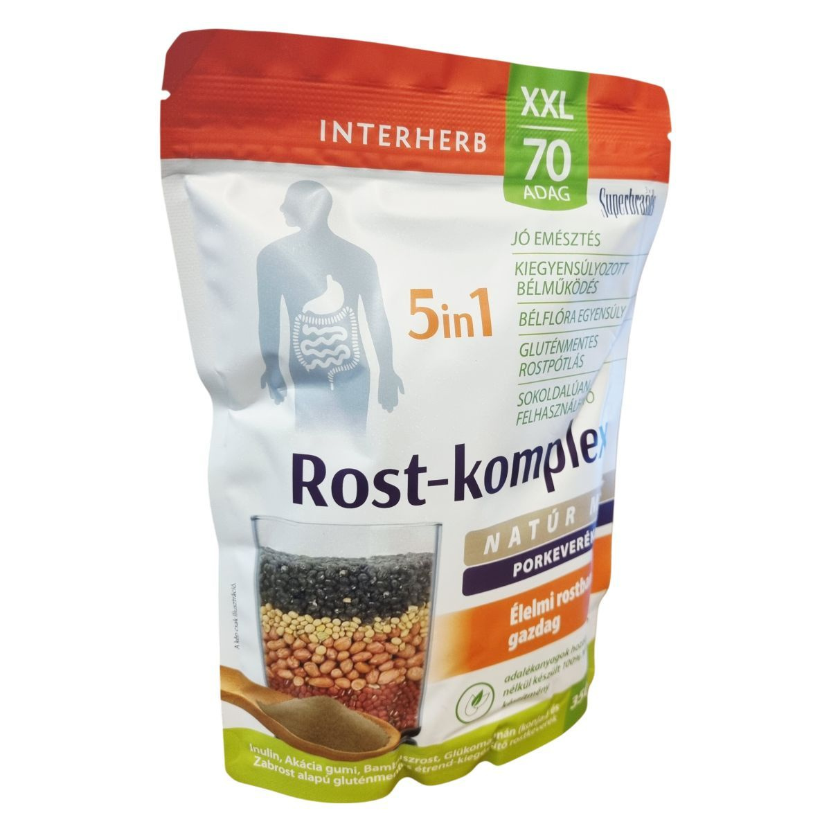Az Interherb Rost-Komplex 5in1 rostkeverék az inulin, akácia gumi, bambuszrost, glükomannán (konjac) és zabrost kombinációján alapuló természetes, adalékanyagoktól mentes étrend-kiegészítő. A termék hozzájárulhat a normál bélműködés fenntartásához, a megfelelő székletmennyiség biztosításához és a bélflóra egyensúlyához, különösen mozgásszegény életmód esetén vagy olyan élethelyzetekben, amikor a bélműködés lassulhat. Az inulin komplex rostként segítheti a vastagbél hasznos baktériumainak növekedését. A rostok vízmegkötő, lágyító és bélmozgást fokozó hatásuk miatt támogathatják az emésztési folyamatokat. A hazai átlagos rostbevitel elmaradhat az ajánlott napi 30 grammtól, ezért a termék fokozatos, változatos rostfogyasztásban segítheti a kiegyensúlyozott táplálkozást. Natúr, ízesítetlen porkeverék, amely könnyen adagolható és sokféle ételbe vagy italba keverhető, miközben 100%-ban vegán és gluténmentes. A csomagolás 100%-ban újrahasznosítható, ezzel támogatva a környezetvédelmet.
