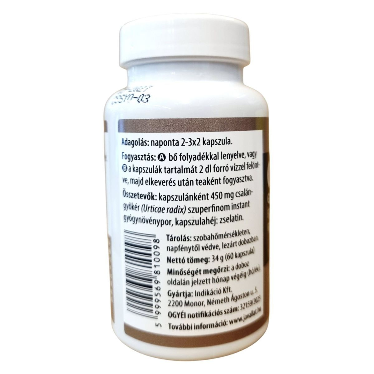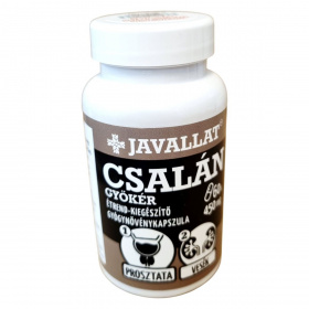 A Javallat Csalángyökér kapszula 450 mg hatóanyagot tartalmazó gyógynövénykészítmény, amelyet a csalán gyökeréből (Urtica radix) készítenek. A kapszula fogyasztása hozzájárulhat a prosztata egészségének fenntartásához és a húgyutak normál működéséhez, továbbá támogathatja a vesék természetes kiválasztó folyamatait. A termék természetes összetételű, zselatin kapszulába töltött, finomra őrölt gyógynövénypor formájában kapható. Praktikus, könnyen adagolható és teaként is fogyasztható. Megbízható magyar gyártótól, az Indikáció Kft.-től származik.