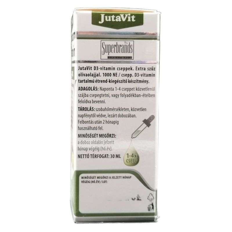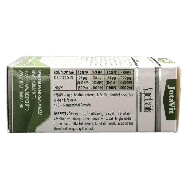 A JutaVit D3-vitamin cseppek a D-vitamint extra szűz olívaolajban oldott formában tartalmazza. A D-vitamin hozzájárul a kalcium és a foszfor normál felszívódásához / hasznosulásához, a vér normál kalciumszintjének fenntartásához, az egészséges csontozat és az egészséges izomfunkció fenntartásához. Hozzájárul a normál fogazat fenntartásához és az immunrendszer normál működéséhez. A D-vitamin szerepet játszik a sejtosztódásban.
