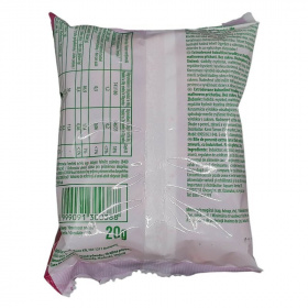 Összetevők: kukoricadara, édesítőszer: eritrit (27%), növényi rost(dextrin),aroma, savanyúságot szabályozó anyag: citromsav, természetes színezék: kárminok.