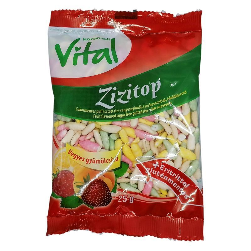 Vital zizitop. Cukormentes puffasztott rizs vegyes gyümölcsízű bevonattal, édesítőszerekkel, eritrittel. 25g, friss, ropogós, kellemes aromájú, gyümölcs íze dominál