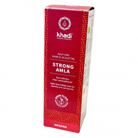 A khadi STRONG AMLA Ayurvédikus hajolaj 50 ml kiszerelésben kapható, német gyártású natúrkozmetikum, amely az Ayurveda hagyományos tudományán alapul. Az Amla kivonat az olaj antioxidáns, anti-aging hatásáról ismert, mely frissíti és regenerálja a hajszálakat és a fejbőrt. A Bhringaraj és Brahmi hatóanyagok erősítik a hajgyökereket, serkentik a haj növekedését, ezáltal támogatva az egészséges, erős haj kialakulását, különösen gyenge vagy vékony haj esetén. A termék összetevőinek többsége ökológiai gazdálkodásból származik, valamint a khadi egyedi, természetes illóolajkompozíciójának köszönhetően friss és kellemes illatot biztosít. A terméket vegán, natúrkozmetikumként minősítették, megfelel az ökocímkék kritériumainak, így környezettudatos választást jelent hajápolásban. Használata rendszeresen ajánlott a haj egészségének megőrzésére. A terméket gyermekek elől védeni kell, és a szemmel való közvetlen érintkezéstől óvni kell.
