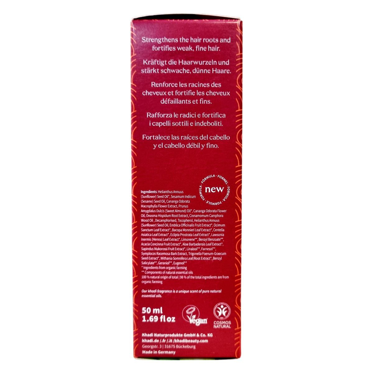 Helianthus Annuus (napraforgó) magolaj*, Sesamum Indicum (szezám) magolaj, Cananga Odorata Macrophylla virágkivonat, Prunus Amygdalus Dulcis (mandula) olaj*, Cananga Odorata virágolaj, Onosma Hispidum gyökérkivonat, Cinnamomum Camphora faolaj, dekamfórozott, Tokoferol, Helianthus Annuus (napraforgó) magolaj, Emblica Officinalis gyümölcskivonat*, Ocimum Sanctum levélkivonat*, Bacopa Monnieri levélkivonat*, Centella Asiatica levélkivonat*, Eclipta Prostrata levélkivonat*, Lawsonia Inermis (henna) levélkivonat*, Limonén**, Benzil-benzoát**, Acacia Concinna gyümölcskivonat*, Aloe Barbadensis levélkivonat*, Sapindus Mukorossi gyümölcskivonat*, Linalool**, Farnesol**, Symplocos Racemosa kéregkivonat, Trigonella Foenum-Graecum magkivonat*, Withania Somnifera levél- és gyökérkivonat*, Benzil-szalicilát**, Geraniol**, Eugenol** *biogazdálkodásból származó összetevők **természetes illóolaj komponensek