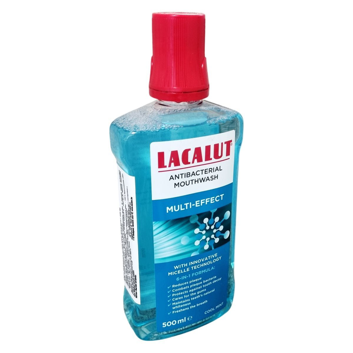A LACALUT Antibacterial Mouthwash innovatív micella technológiával hatékonyan távolítja el a fogak közötti lepedéket, akár a nehezen elérhető területekről is. Hatékonyan csökkenti a lepedékképző baktériumokat, védi a fogakat a károsodástól, gondoskodik az íny egészségéről, megőrzi a fogak természetes fehérségét, és friss leheletet biztosít. A szájvíz 6 az 1-ben formula révén komplex védelmet nyújt a fogak és az íny számára.