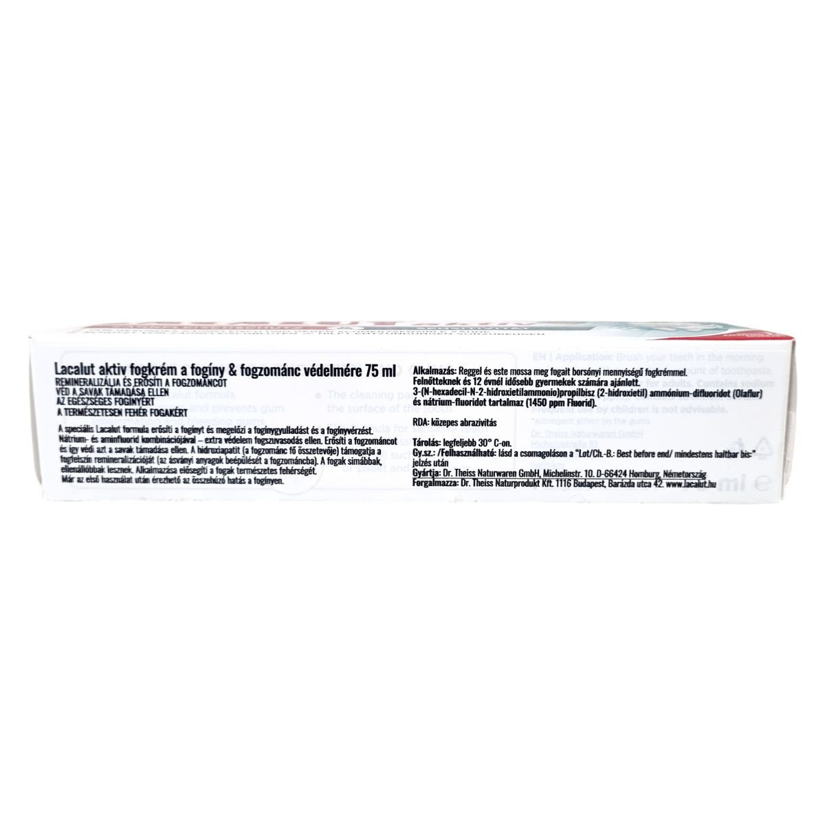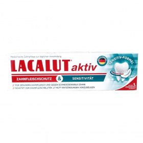 A Lacalut aktiv fogkrém speciális formulája hatékonyan segíti a fogíny erősítését, megelőzi annak gyulladását és vérzését. Nátrium- és aminfluorid kombinációjával extra védelmet nyújt a fogszuvasodás ellen, miközben a hidroxiapatit elősegíti a fogzománc ásványi anyag beépülését és erősíti a fogfelszínt. A kezelés eredményeként a fogak ellenállóbbak és természetesen fehérek lesznek. Már az első alkalmazás után érezhető összehúzó hatást biztosít a fogínyen. A termék közepes abrazivitású, a fogápolás rutin részeként használva segít megőrizni az egészséges fogínyt és fogzománcot.