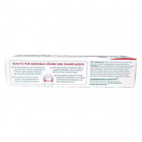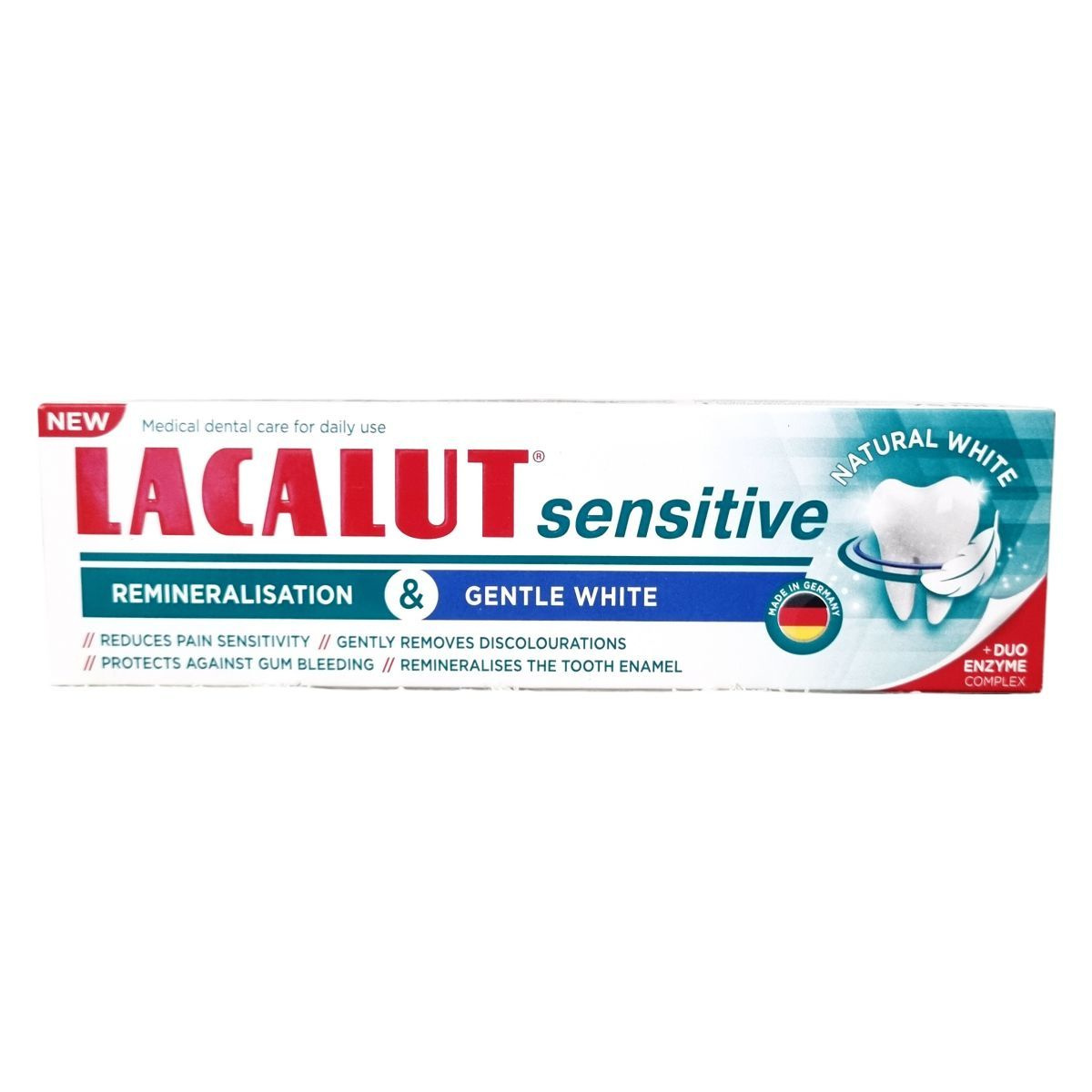 A Lacalut sensitive fogkrém orvosi célú napi fogápolásra készült, természetes fehérséget biztosít és gyengéden eltávolítja az elszíneződéseket. Hatékonyan csökkenti a fájdalomérzékenységet, különösen a fognyak területén, mivel gátolja az ingerületek továbbítását. A formula védi az érzékeny fogakat a külső behatások ellen, erősíti a fogínyt, valamint megelőzi az ínygyulladást és az ínyvérzést. Alacsony abrazivitású, így kíméletes a fogzománchoz, miközben remineralizálja azt és támogatja a fogíny egészségét. A termék DUO enzimeket tartalmaz, melyek hozzájárulnak a hatékonysághoz. Made in Germany, fogorvosok által tesztelt.