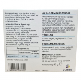A MAGNOSOLV Sport egy kényelmesen alkalmazható, szájban oldódó granulátum formájú étrendkiegészítő, amely tasakonként 400 mg magnéziumot tartalmaz. A magnézium hozzájárulhat az idegrendszer, az energiatermelő anyagcsere-folyamatok és az izmok normális működéséhez. A termék cukormentes, narancsízű, és édesítőszereket tartalmaz. A granulátum közvetlenül a nyelvre öntve, víz nélkül is bevehető, így ideális választás lehet azok számára, akik gyors és egyszerű megoldást keresnek a magnéziumbevitelre. Az étrendkiegészítők nem helyettesítik a változatos, kiegyensúlyozott táplálkozást és az egészséges életmódot.