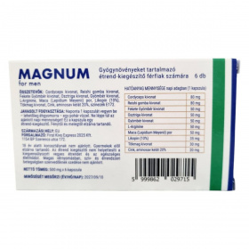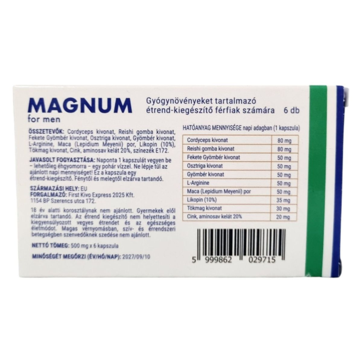 A csomag 6 db, egyenként 500 mg-os kapszulát tartalmaz. A hatóanyagok között több gombakivonat (cordyceps, reishi), fekete gyömbér, osztriga és gyömbér kivonat, továbbá L-arginin, maca por, likopin, tökmag kivonat és cink (aminosav-kelát) található. Származási hely: EU.