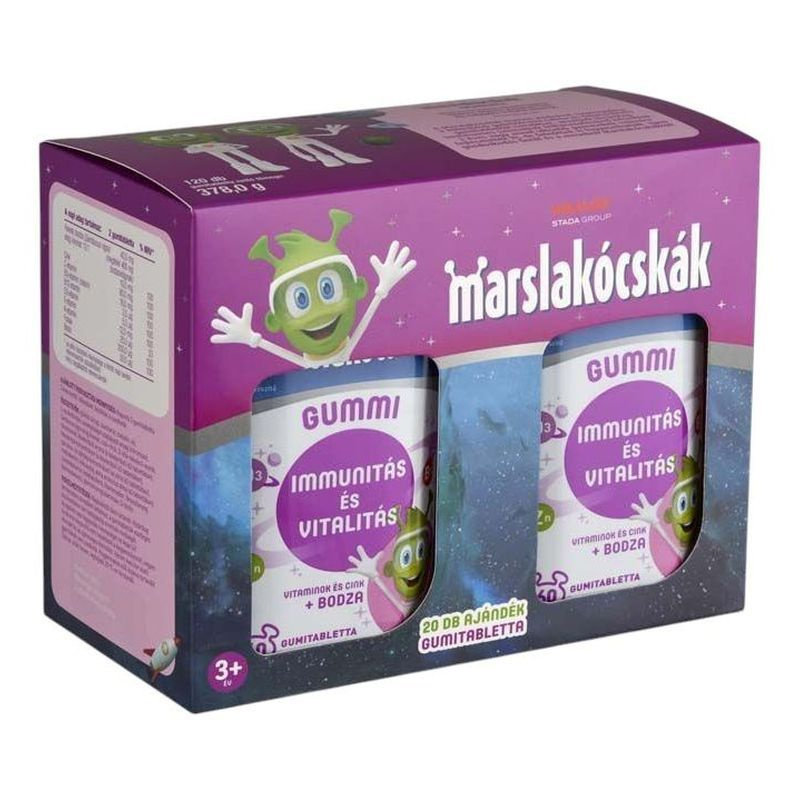 A Marslakócskák Gummi Bodzával csomagolása 2 különböző gyümölcsízű (alma és feketeribizli) gumitablettát tartalmaz, amelyek kizárólag természetes színezékek felhasználásával készültek.Adagolás: Naponta 2 gumitabletta javasolt 3 éves kortól.