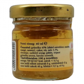Összetevők: gyümölcs 45% (eltérő mértékben: ananász, mangó, narancs), cukor, víz, méz 3,5%, citromsav, zselésítő anyag: pektin, trópusi gyümölcs aroma, karotin színezék.