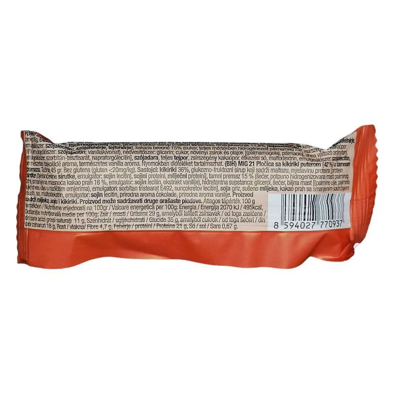 A Mig 21 mogyoróvajas energiaszelet egy ízletes és tápláló snack, amely ideális választás mindazok számára, akik aktív életmódot folytatnak, vagy egyszerűen csak szeretnék feldobni a napjukat egy finom, energikus falattal. Ez a 45 grammos energiaszelet csokoládé ízű, és gazdag földimogyoróvajas töltelékkel rendelkezik, amely nemcsak ízletes, hanem tápláló is. Az étcsokoládé bevonat még vonzóbbá teszi a terméket, így minden falat egy igazi ízélményt nyújt. A Mig 21 mogyoróvajas energiaszelet gluténmentes, így a gluténérzékenyek is bátran fogyaszthatják. A henger alakú forma praktikus, könnyen hordozható, így ideális választás lehet edzés előtt vagy után, munkahelyi snackként, vagy akár egy hosszú utazás során is. A termék protein tartalma hozzájárul a napi fehérjeszükséglet kielégítéséhez, így segít az izomzat fenntartásában és regenerálódásában.