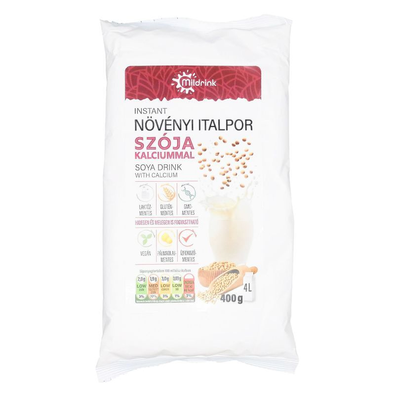 400 g porból akár 4 l italt is készíthet, ezzel csökkentve a hulladékképződést, így a MILDRINK szója italport környezetbarát terméknek tekinthetjük. Felhasználás: Termékünkkel kiválthatja étrendjében az állati eredetű tejet. Használható reggeli italok elkészítéséhez, gabonapelyhek, müzlikeverékek fogyasztásához, de szélesközűen alkalmazható a sütés-főzés minden területén (pl.: kásák, sütemények, levesek, főzelékek, krémek és pudingok készítésénél). Elkészítése: Keverjen legalább 10g (1 evőkanál vagy 3 kávéskanál) italport 100ml meleg vagy langyos vízhez (hideg ital készítésénél használjon turmixgépet). Ha nem érzi elég tejesnek az elkészült italt, ízlés szerint emelje a keverékben az italpor arányát. Tárolás: Maximum 25 °C-on 70% relatív nedvességtartalom mellett. Felbontás után gondosan zárja vissza a csomagot, ezzel megakadályozhatja a termék csomósodását. Összetevők: glükózszirup, növényi zsír 20% (kókusz, szója), dextróz, maltodextrin, szójafehérje koncentrátum 7%, kálcium-foszfát 3 %, stabilizátor: kálium-foszfát (E340), emulgeálószer: zsírsavak mono- és digliceridjei (E471), színezék: karotin, csomósodást gátló: szilícium-dioxid.