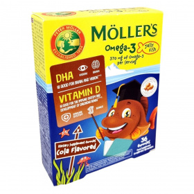 Möller’s Omega-3 halacska gumivitamin étrend-kiegészítő gyerekeknek D-vitaminnal, kóla ízesítéssel. A termék DHA-t tartalmaz, amely hozzájárul az agy és a látás normál működéséhez. A kedvező hatás eléréséhez napi min. 250 mg DHA szükséges. A D-vitamin hozzájárul az immunrendszer normál működéséhez, valamint a gyermekek csontozatának normál növekedéséhez és fejlődéséhez.