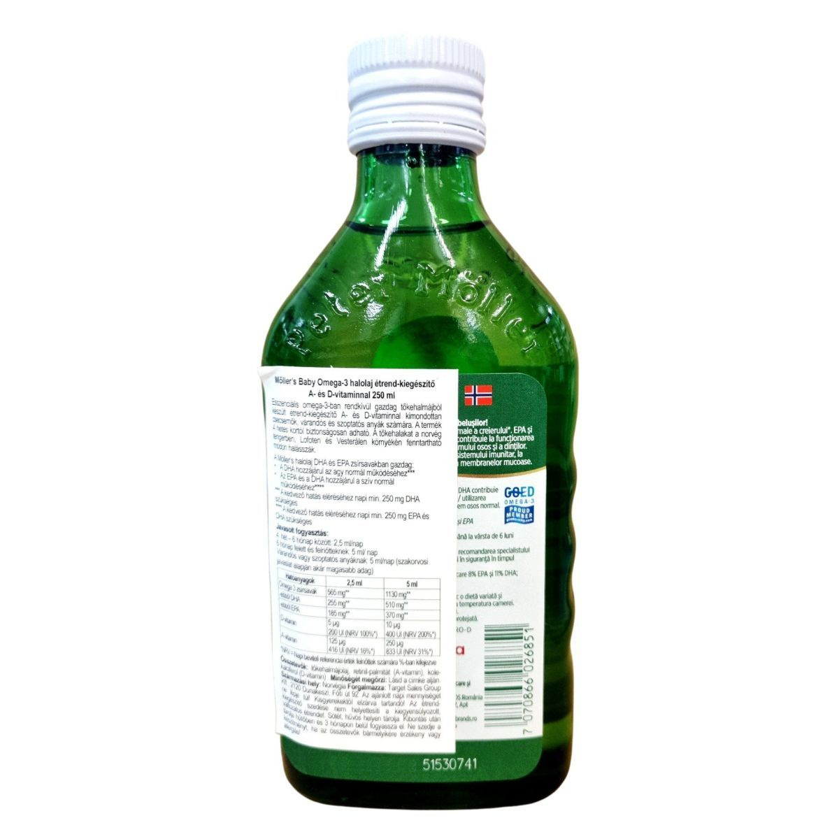 Möller’s Baby Omega-3 halolaj étrend-kiegészítő A- és D-vitaminnal. Esszenciális omega-3-ban gazdag tőkehalmájolajból készült termék. A tőkehalakat a norvég tengeren, Lofoten és Vesterålen környékén fenntartható módon halásszák. A DHA hozzájárul az agy normál működéséhez, az EPA és DHA a szív normál működéséhez, a D-vitamin pedig az immunrendszer normál működéséhez.