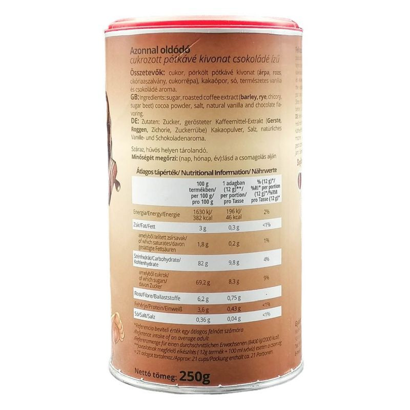 Összetevők: cikória gyökér, csokoládé ízesítés, természetes aromák.