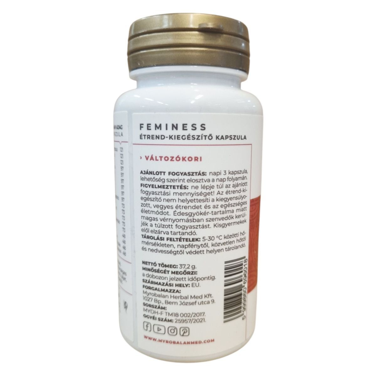 A Feminess étrend-kiegészítő kapszula változókori támogatást nyújthat a nők számára. A termék különböző gyógynövényeket tartalmaz, mint például a fürtös spárga és az arab jázmin, amelyek hozzájárulhatnak a hormonális egyensúly fenntartásához. A kapszulák vegetáriánus és vegán étrendbe is beilleszthetők, valamint glutén-, laktóz- és szójamentesek. A termék nem tartalmaz ízfokozót, mesterséges színezéket és ízesítőt, édesítőt, cukrot, búzát és élesztőt. A Feminess kapszulák napi ajánlott mennyisége 3 kapszula, amelyeket lehetőség szerint elosztva a nap folyamán érdemes fogyasztani. Az édesgyökér-tartalom miatt magas vérnyomásban szenvedők számára csak orvosi felügyelet mellett ajánlott a fogyasztása. A termék tárolása 5-30 °C közötti hőmérsékleten, napfénytől, közvetlen hőtől és nedvességtől védett helyen javasolt.