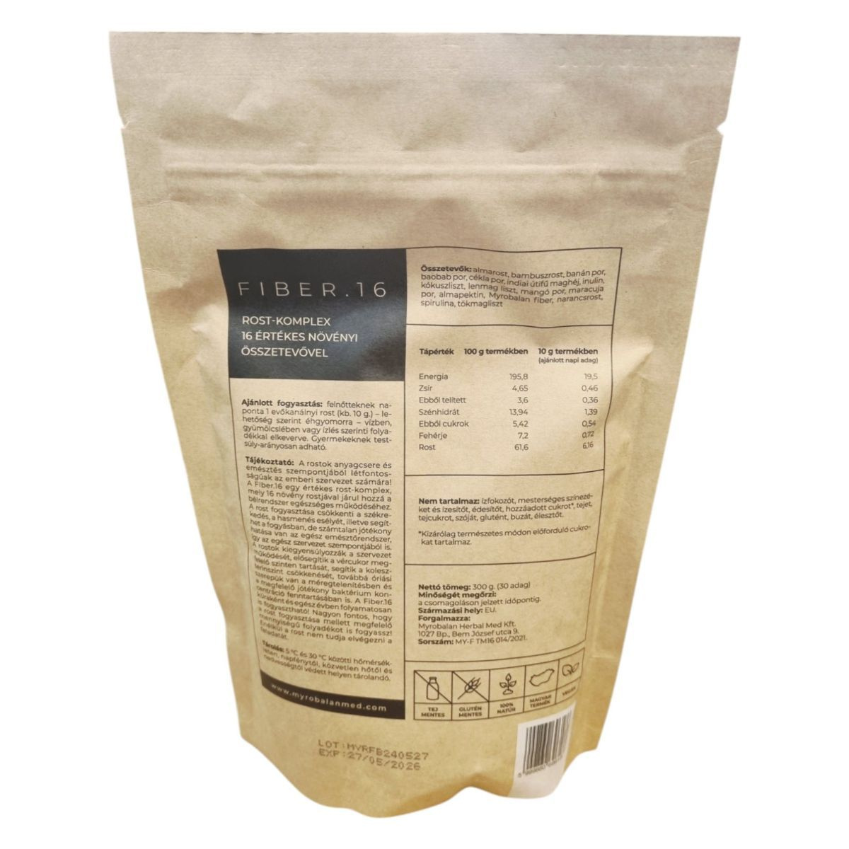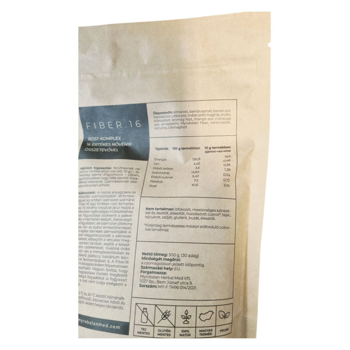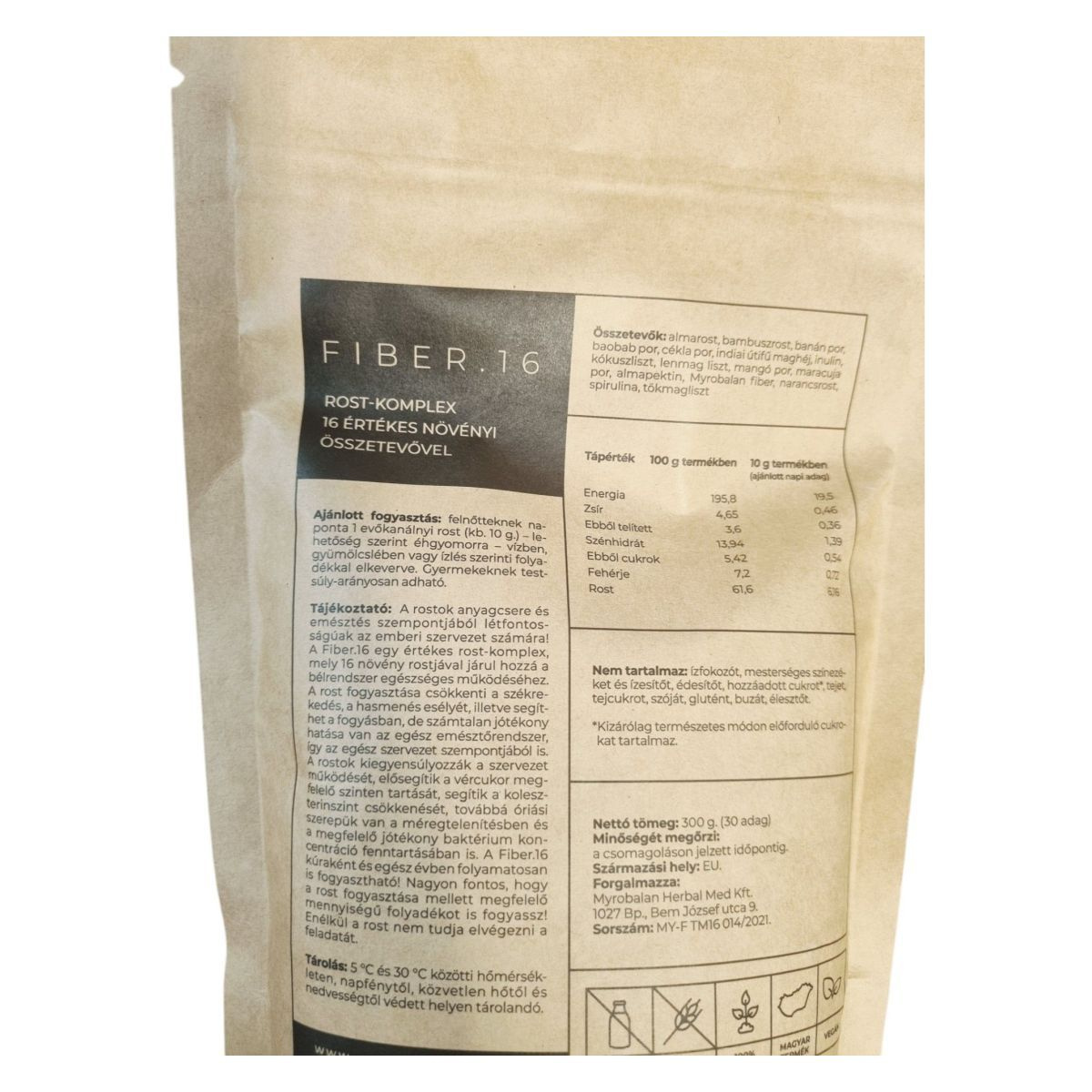 A Fiber.16 egy bélrendszer tisztítására szolgáló növényi rost-komplex, amely 16 értékes növényi összetevőt tartalmaz. A termék fogyasztása segíthet a bélrendszer egészséges működésének fenntartásában, a székrekedés és hasmenés kockázatának csökkentésében, valamint a méregtelenítés támogatásában. A rostok hozzájárulhatnak a vércukorszint és a koleszterinszint megfelelő szinten tartásához, valamint a bélflóra egészségéhez. A termék vegán, gluténmentes és tejmentes, így széles körben alkalmazható különböző étrendi igények kielégítésére. Fontos a megfelelő mennyiségű folyadék bevitele a rostok vízmegkötő képessége miatt.