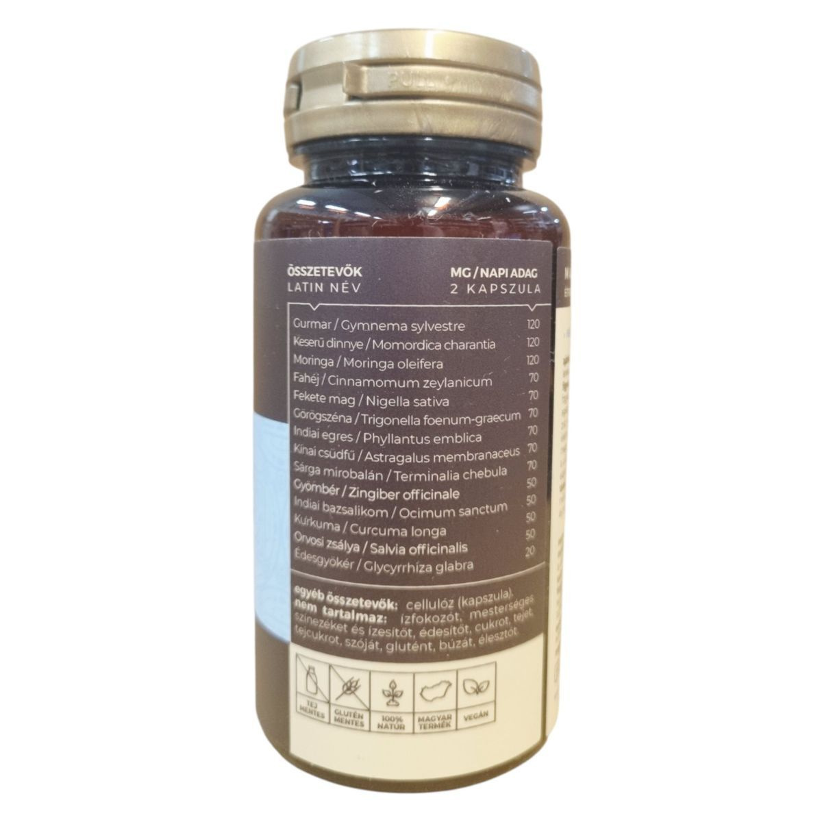 Gurmar (Gymnema sylvestre) 120 mg, Keserű dinnye (Momordica charantia) 120 mg, Moringa (Moringa oleifera) 120 mg, Fahéj (Cinnamomum zeylanicum) 70 mg, Fekete mag (Nigella sativa) 70 mg, Indiai egres (Phyllantus emblica) 70 mg, Görögszéna (Trigonella foenum-graecum) 70 mg, Kínai csüdfű (Astragalus membranaceus) 70 mg, Sárga mirobalán (Terminalia chebula) 50 mg, Gyömbér (Zingiber officinale) 50 mg, Indiai bazsalikom (Ocimum sanctum) 50 mg, Kurkuma (Curcuma longa) 50 mg, Orvosi zsálya (Salvia officinalis) 50 mg, Édesgyökér (Glycyrrhiza glabra) 50 mg.