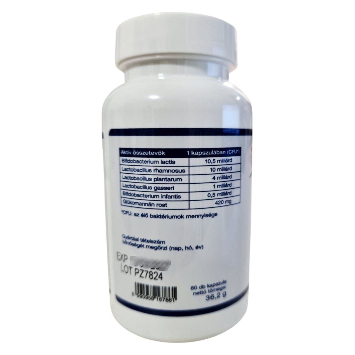 B. lactis, L. rhamnosus, L. plantarum, L. gasseri, B. infantis, konjak gyökér kivonat (95% glükomannán), HPMC cellulóz kapszulahéj (gyomorsaválló).