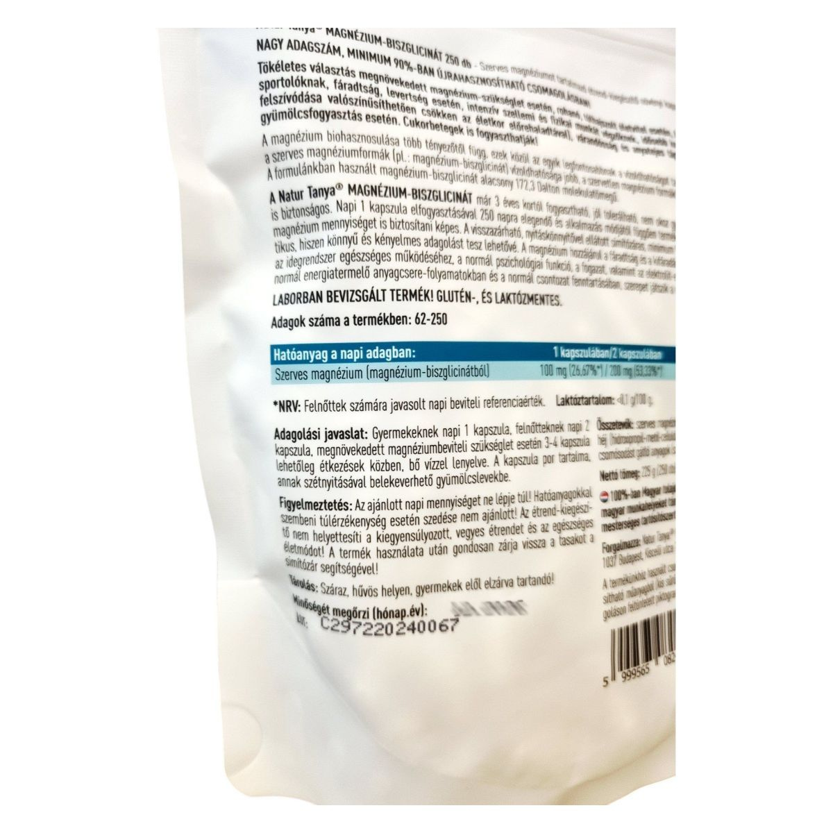 A Natur Tanya Magnézium-biszglicinát szerves, aminosav-kelát formában tartalmazza a magnéziumot, amely kiválóan hasznosuló és jól tolerálható forrás. A termék nagy adagolási számú (250 db kapszula), így hosszú távú kúrát tesz lehetővé. A magnézium hozzájárulhat az idegrendszer és az izomzat normál működéséhez, az elektrolit-egyensúly fenntartásához, valamint a fehérjeszintézis és sejtosztódás normál folyamatához. A vegán kapszulában lévő, magas biológiai hasznosulású magnézium-biszglicinát jól felszívódik, nem terheli a gyomrot, és alkalmas a mindennapi magnézium-pótlásra. A csomagolás minimum 90%-ban újrahasznosítható, a termék nem tartalmaz mesterséges tartósítószert, színezéket vagy aromát, 100%-ban magyar tulajdonú cég fejlesztése.