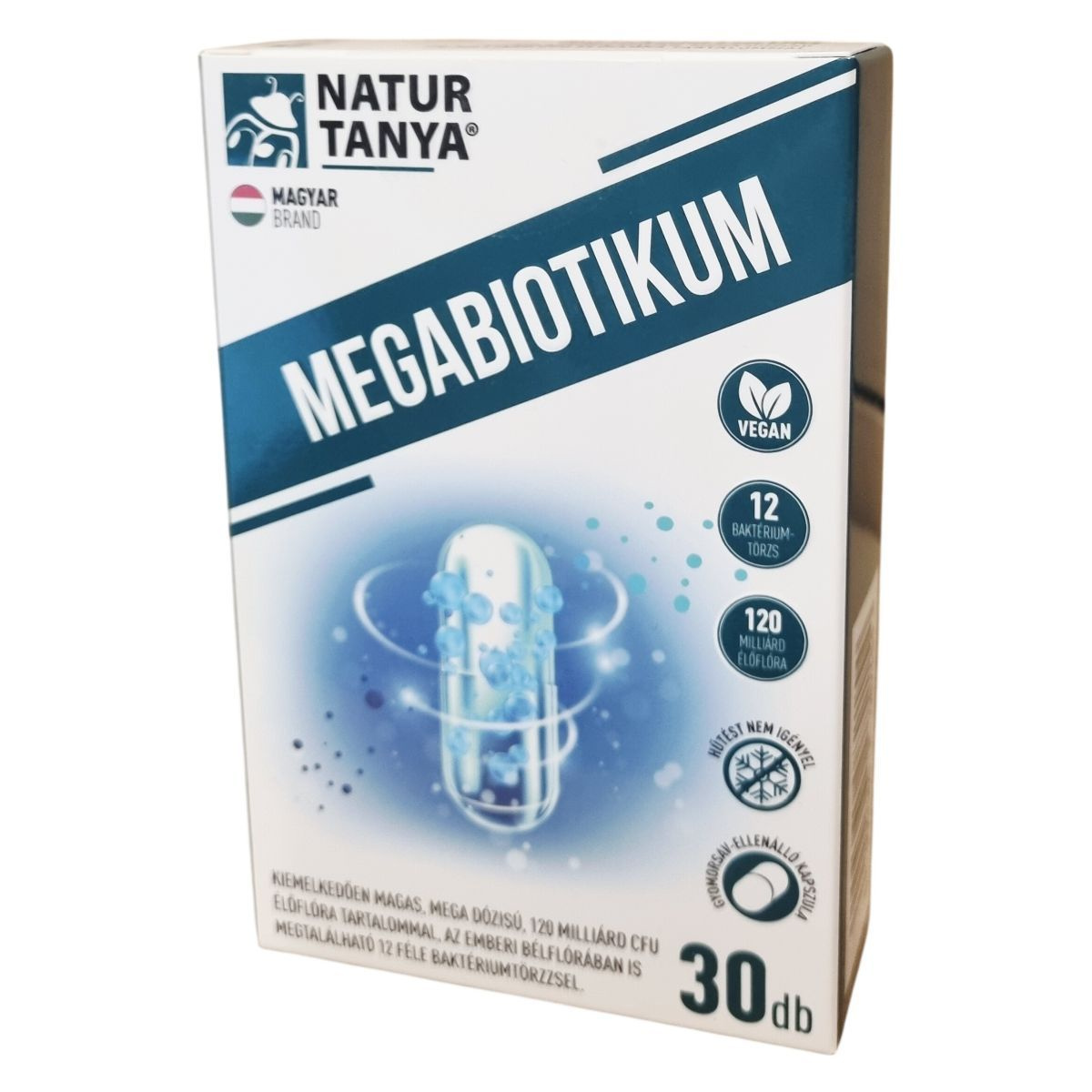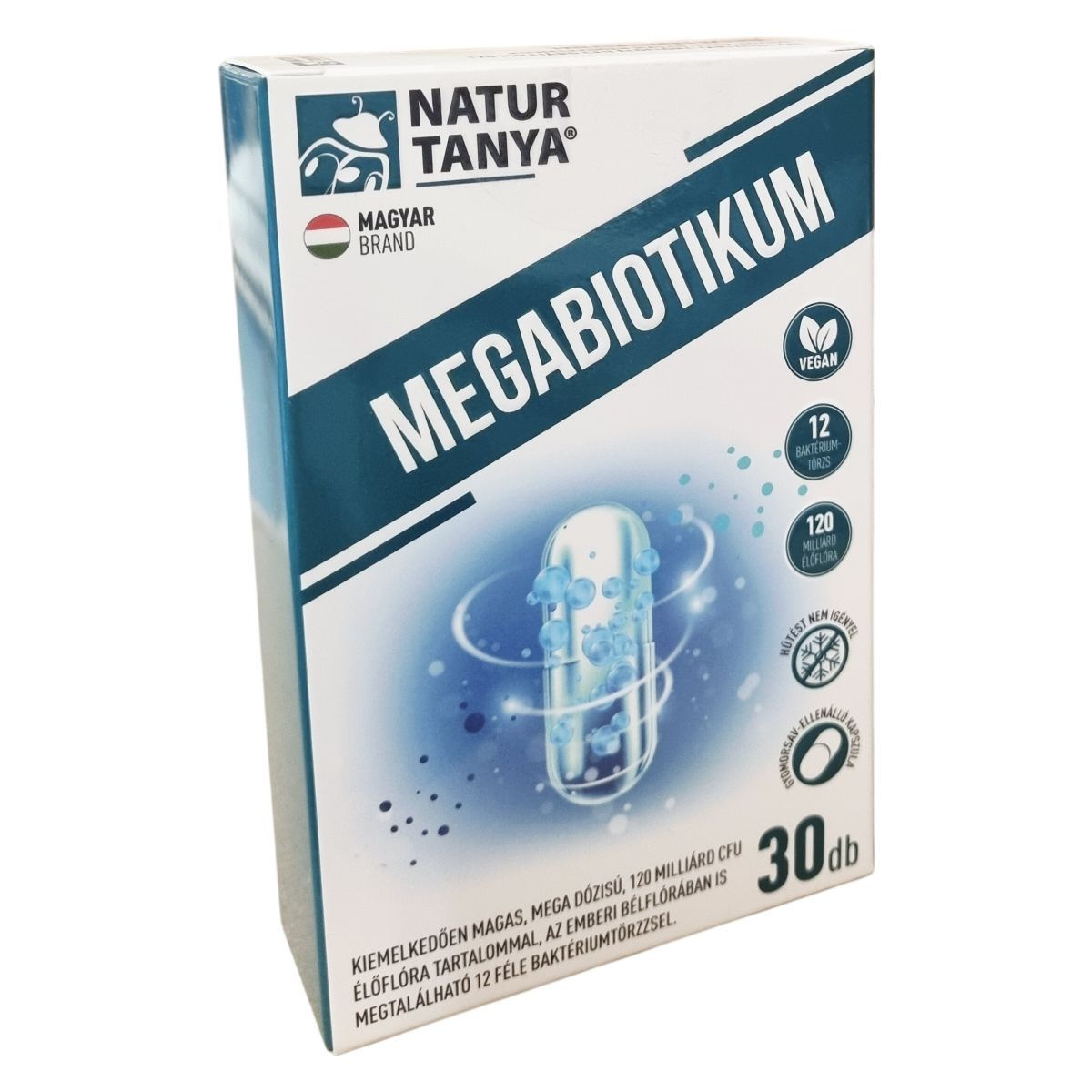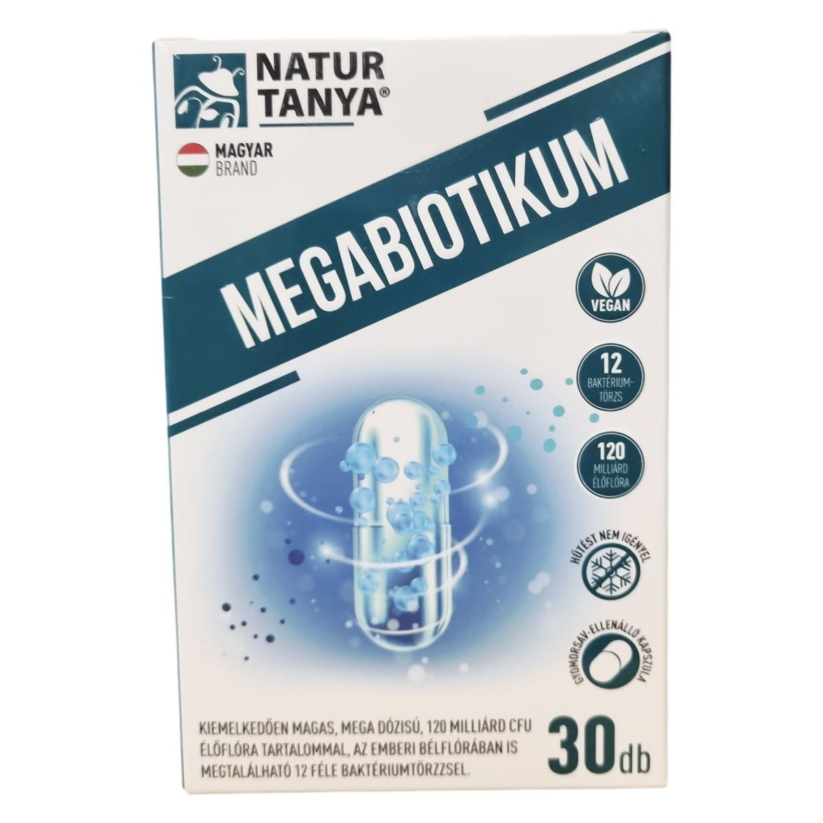 A Natur Tanya® Megabiotikum egy laborban bevizsgált étrend-kiegészítő, amely 12 különböző, az emberi bélflórában is megtalálható baktériumtörzset tartalmaz, összesen 120 milliárd CFU élőflóra mennyiségben. A termék különlegessége a gyomorsav-ellenálló kapszula, mely megóvja a hatóanyagokat a gyomorsav negatív hatásától, így biztosítva azok megfelelő célba jutását. Az élőflórát fermentált guárbab kivonatból készült PHGG rost egészíti ki, amely hozzájárulhat a bélrendszer egészségének támogatásához. A készítmény glutén- és laktózmentes, nem tartalmaz mesterséges tartósítószert, színezéket és aromát, valamint teljes mértékben vegán. A termék magyar tulajdonú cég gyártása, támogatva ezáltal a hazai munkahelyeket. A napi adagolás során ajánlott a kapszulát étkezés közben bő folyadékkal bevenni, viszont nyelési nehézség esetén a kapszula tartalma elvehető hideg ételbe vagy italba. Antibiotikumos kezelés alatt is beilleszthető az étrendbe, megfelelő időköz megtartásával az antibiotikum bevétele mellett.