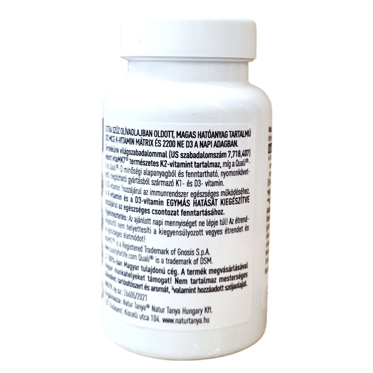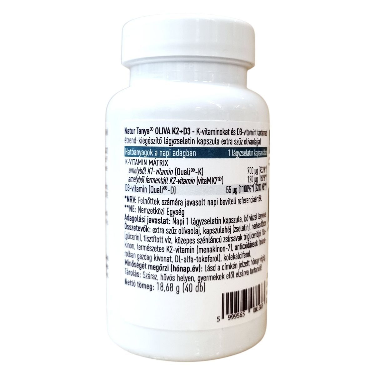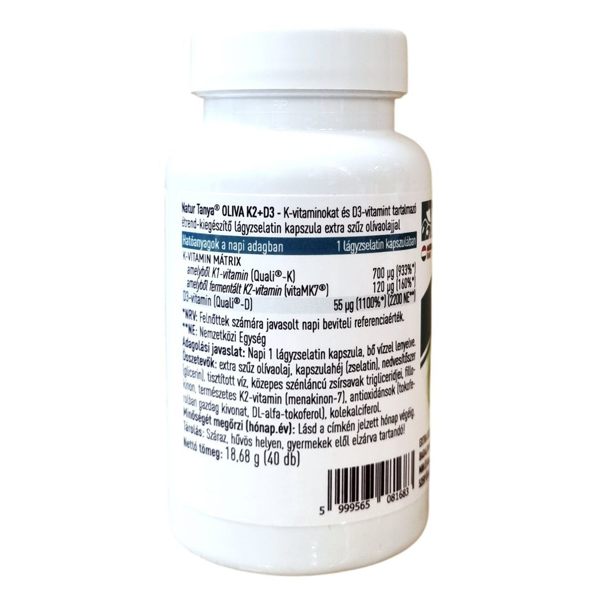 A Natur Tanya® OLIVA K2+D3 egy prémium minőségű étrend-kiegészítő, amely természetes K2-vitamint (vitaMK7®), K1-vitamint (Quali®-K) és D3-vitamint (Quali®-D) tartalmaz extra szűz olívaolajban oldva. A termék világszabadalommal védett K2-vitamint tartalmaz, továbbá fenntartható, nyomonkövethető gyártásból származó, megbízható alapanyagokat használ. A benne lévő D3-vitamin hozzájárulhat az immunrendszer egészséges működéséhez, míg a K- és D3-vitamin együttes hatásuk révén támogathatják az egészséges csontozat fenntartását. A készítmény nem tartalmaz mesterséges színezéket, tartósítószert és aromát, valamint hozzáadott szójaolajat sem. Magyar tulajdonú cég terméke, mely megvásárlásával hazai munkahelyeket támogat.