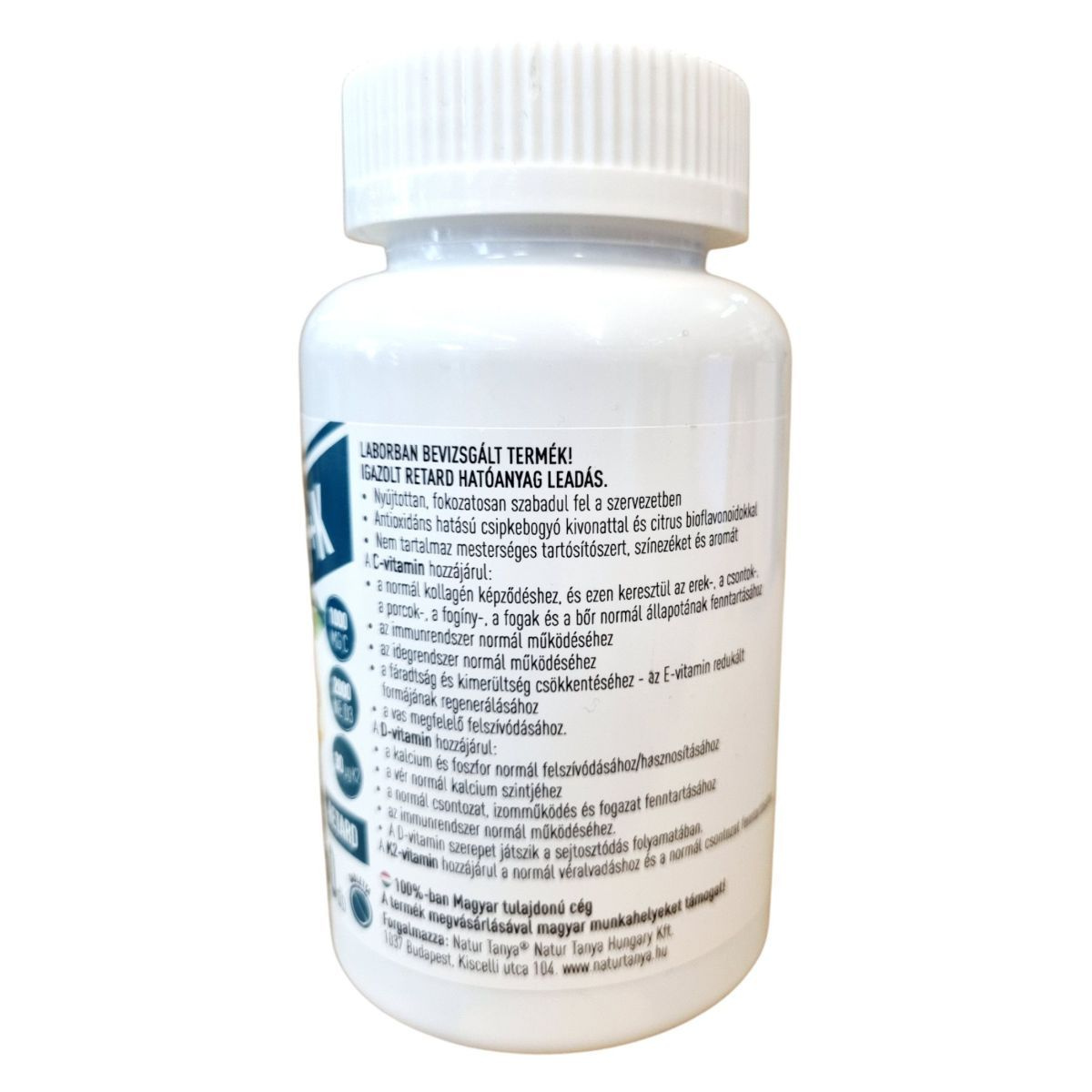 LABORBAN BEVIZSGÁLT TERMÉK! IGAZOLT RETARD HATÓANYAG LEADÁS. Nyújtott, fokozatosan szabadul fel a szervezetben. Antioxidáns hatású csipkebogyó kivonattal és citrus bioflavonoidokkal. Nem tartalmaz mesterséges tartósítószert, színezéket és aromát. A C-vitamin hozzájárul a normál kollagén képződéshez, az immunrendszer és az idegrendszer normál működéséhez, a fáradtság és kifáradás csökkentéséhez. A D-vitamin hozzájárul a kalcium és a foszfor normál felszívódásához, a vér normál kalciumszintjéhez, az egészséges csontozat és fogazat fenntartásához. A K-vitamin részt vesz a normál véralvadásban és hozzájárul az egészséges csontozat fenntartásához.