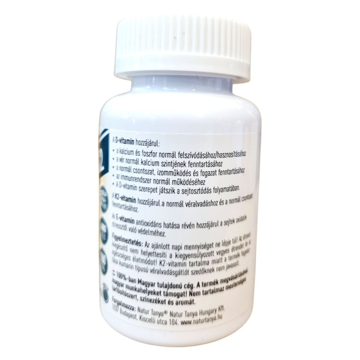 Természetes D3-, fermentált K2- és antioxidáns E-vitamint tartalmazó étrend-kiegészítő tabletta, amely támogatja az immunrendszert, csontozatot és véralvadást.