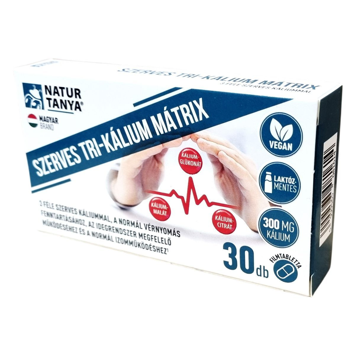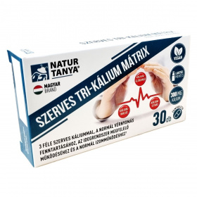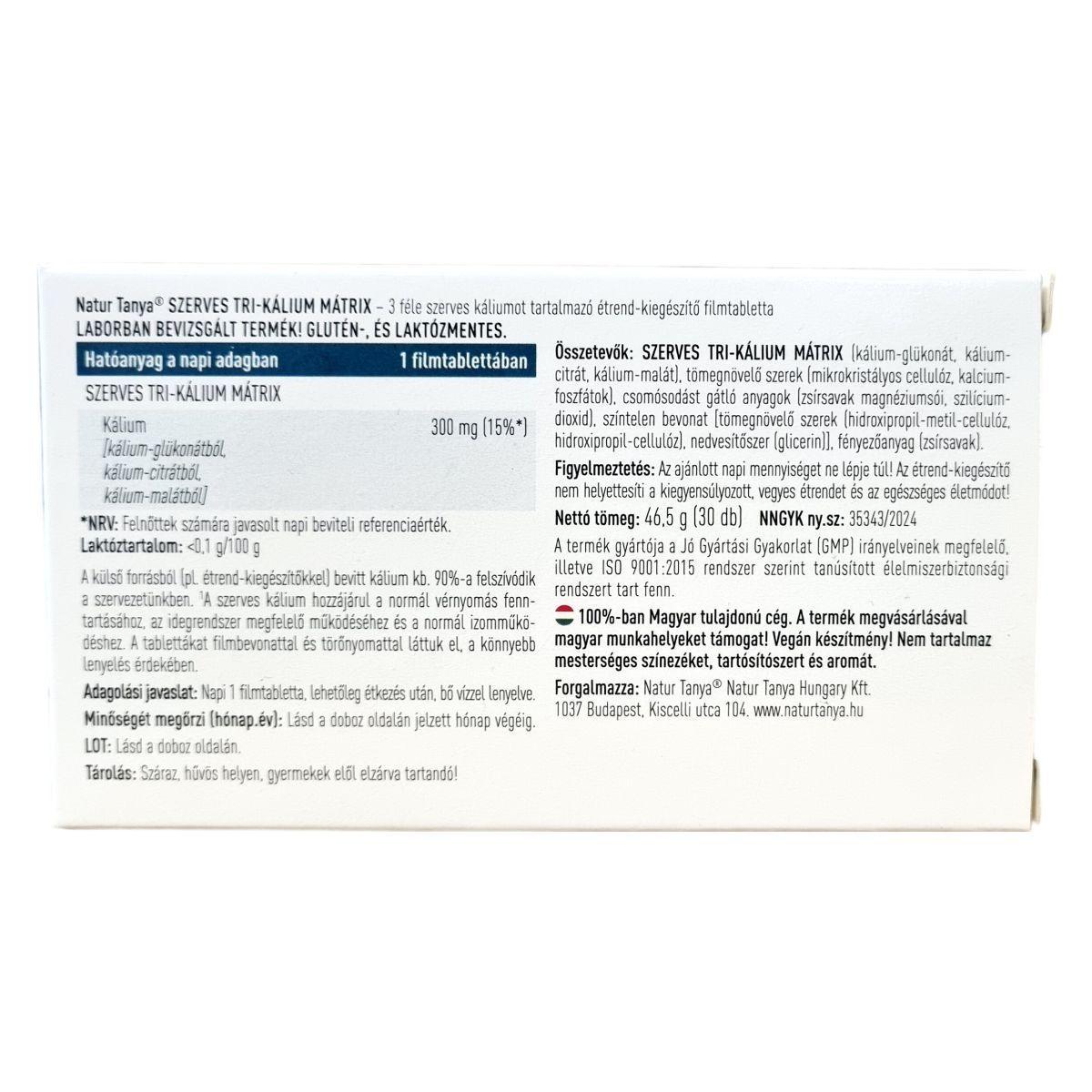 A Natur Tanya® Szerves Tri-Kálium Mátrix olyan laborban bevizsgált étrend-kiegészítő filmtabletta, amely háromféle szerves kálium vegyületből – kálium-glükonátból, kálium-citrátból és kálium-malátból – áll össze egy napi adagban 300 mg káliumot biztosítva. A kálium a szervezetünkben magas felszívódási arány mellett támogatni tudja a normál vérnyomás megtartását, az idegrendszer megfelelő működését és a normál izomműködést. A termék filmbevonattal és törőnyomattal készült a könnyebb lenyelhetőség érdekében. A készítmény glutén- és laktózmentes, nem tartalmaz mesterséges színezéket, tartósítószert vagy aromát, továbbá vegán és 100%-ban magyar tulajdonú cég gyártja. A termék megvásárlásával magyar munkahelyek is támogathatók.