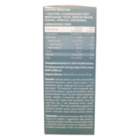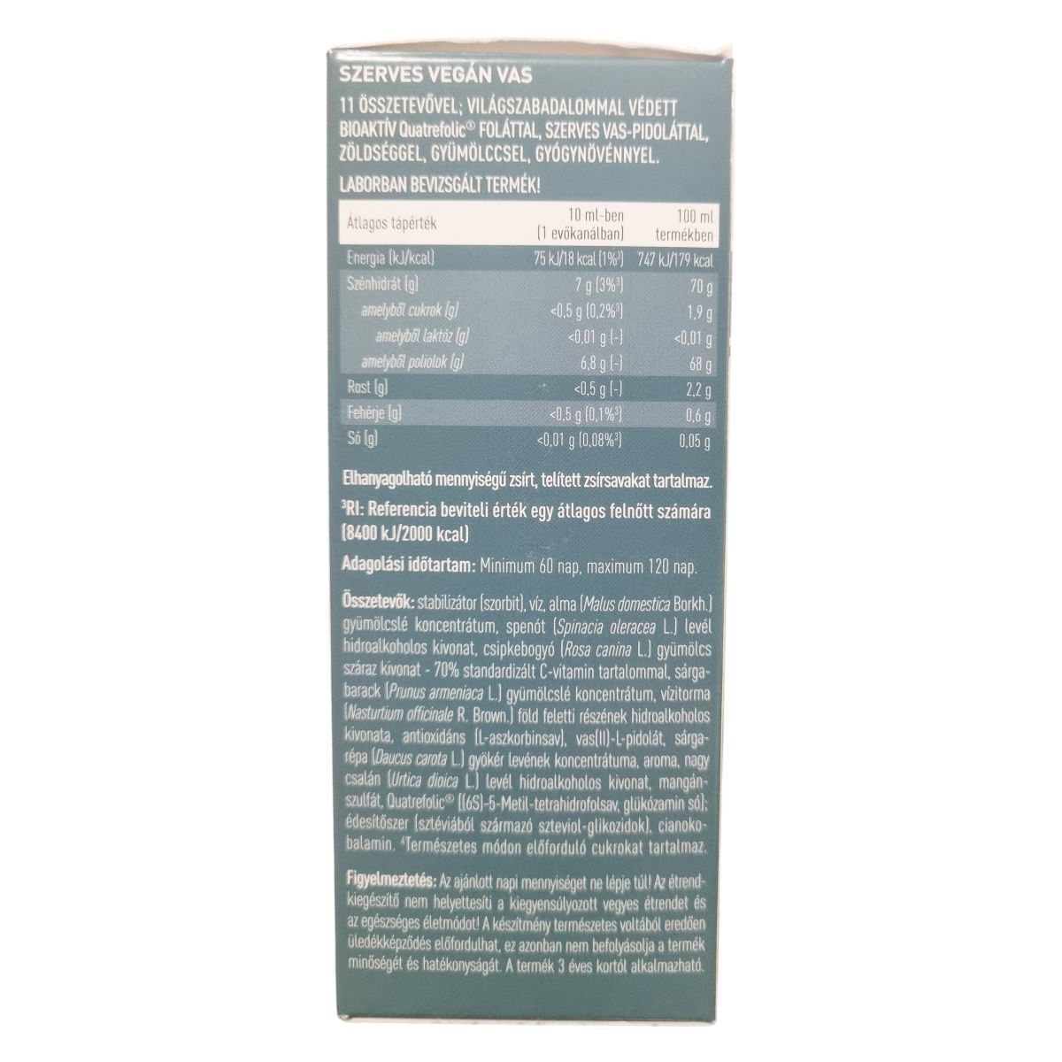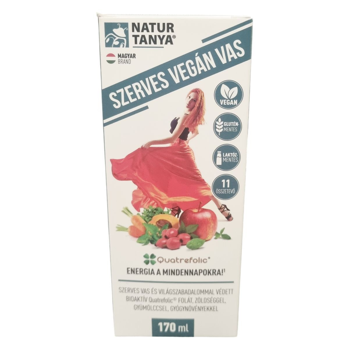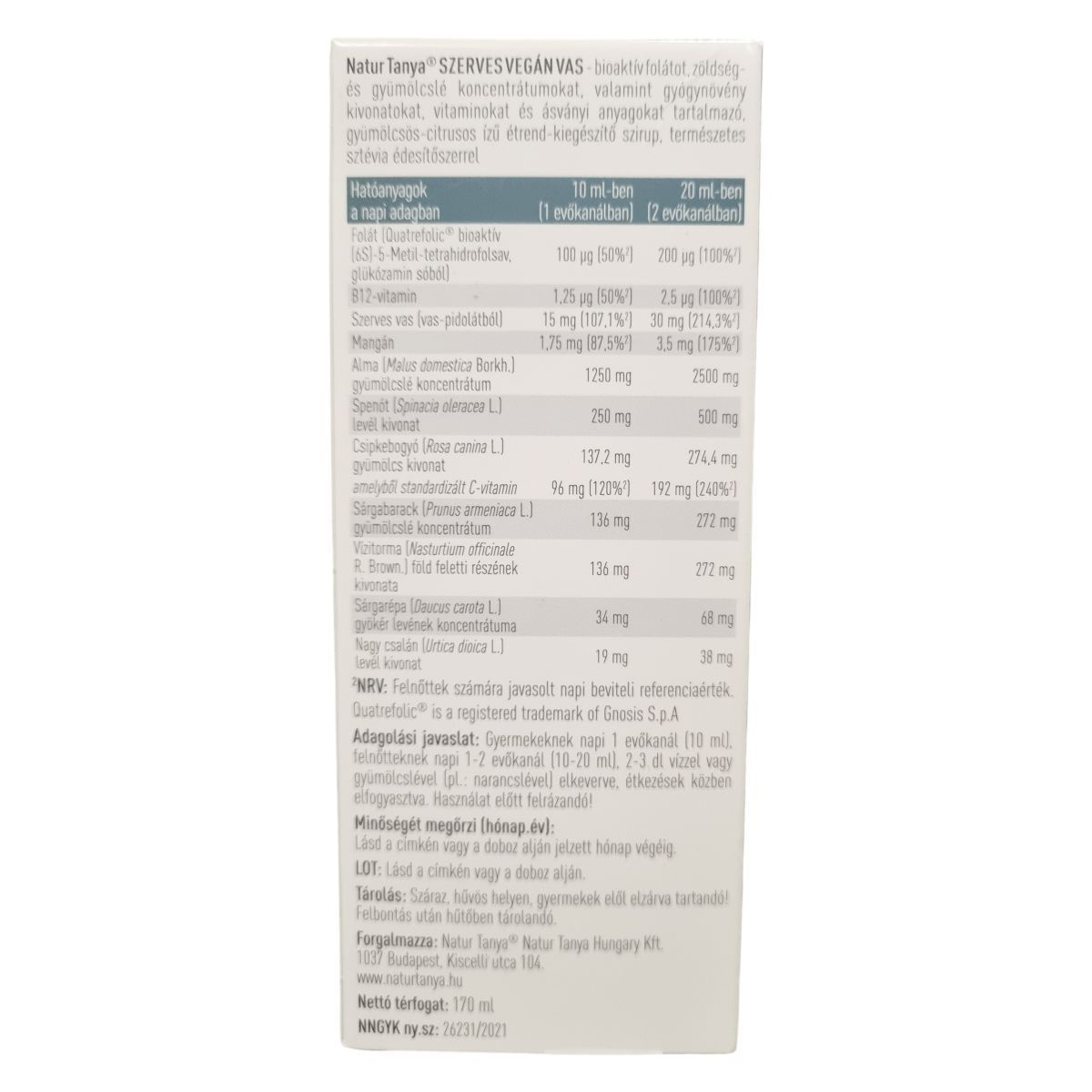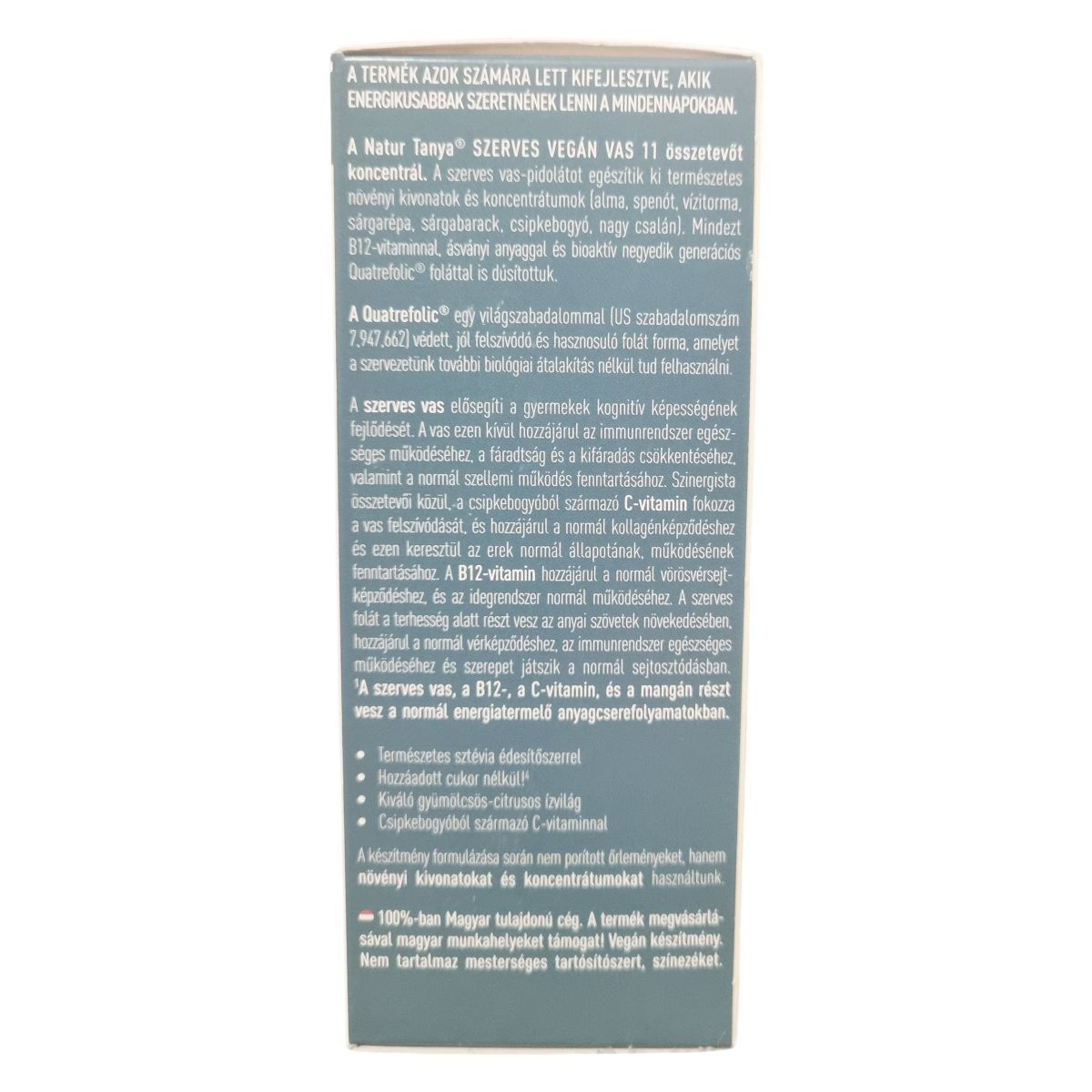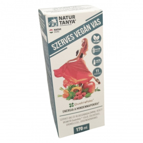 A Natur Tanya® Szerves Vegán Vas egy laboratóriumban bevizsgált étrend-kiegészítő, amely 11 természetes összetevőt koncentrál, köztük szerves vas-pidolátot és a világszabadalommal védett Quatrefolic® bioaktív folátot. A termék természetes növényi kivonatokat és koncentrátumokat tartalmaz alma, spenót, vízitorma, sárgarépa, sárgabarack, csipkebogyó és nagy csalán felhasználásával. Kiemelten fontos benne a B12-vitamin és a csipkebogyóból származó C-vitamin, amelyek hozzájárulhatnak a normál vörösvérsejt-képződéshez, az immunrendszer egészséges működéséhez, a fáradtság csökkentéséhez, valamint a kollagénképződés és az érrendszer normál működésének fenntartásához. A Quatrefolic® folát jól felszívódó, további biológiai átalakítás nélkül hasznosuló forma, amely részt vesz az energiatermelő anyagcserefolyamatokban. A készítmény természetes sztévia édesítőszerrel készül, hozzáadott cukrot nem tartalmaz, és vegánok számára is alkalmas. A termék támogatja az energikus mindennapokat és a gyermekek kognitív képességeinek fejlődését, miközben egyaránt fontos szerepet játszhat a normál sejtosztódásban és vérképződésben.