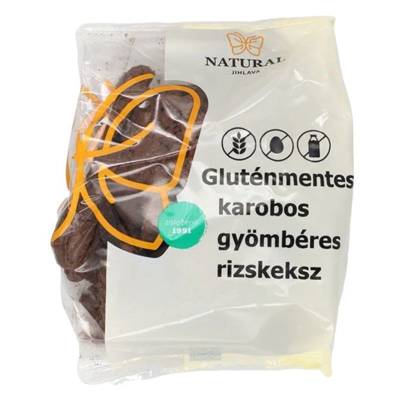 Közvetlen fogyasztásra alkalmas gluténmentes karobos rizskeksz gyömbér ízesítéssel.