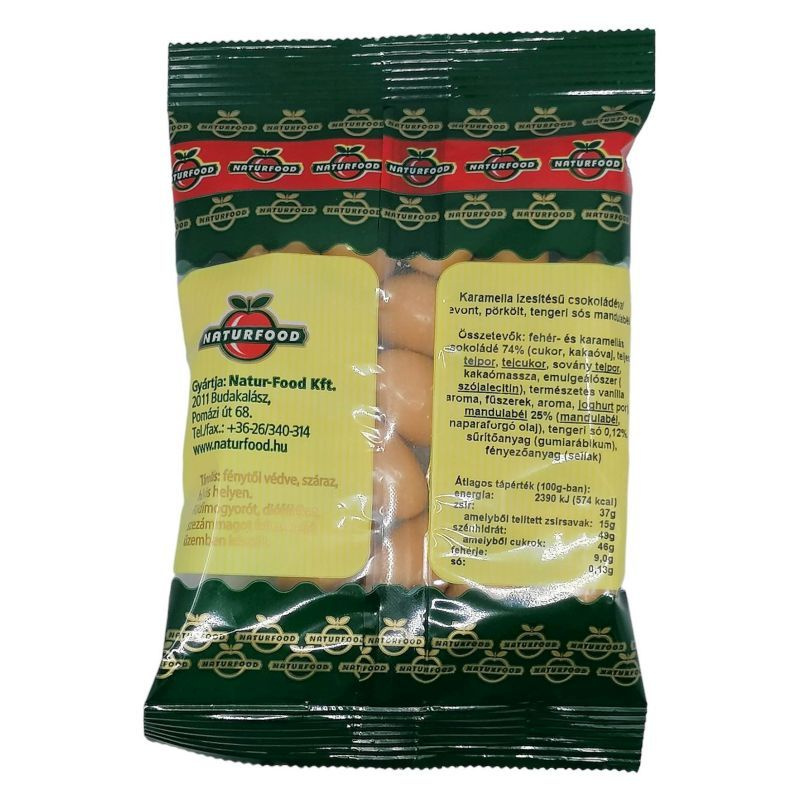 Összetevők: fehér és karamellás csokoládé 74 % (cukor, kakaóvaj, teljes tejpor, tejcukor, sovány tejpor, kakaómassza, emulgeálószer (szójalecitin), természetes vanília aroma, fűszerek, aroma, joghurt por), mandulabél 25% (mandulabél, napraforgóolaj), tengeri só, 0,12%, sűrítőanyag (gumiarábikum), fényezőanyag (sellak).