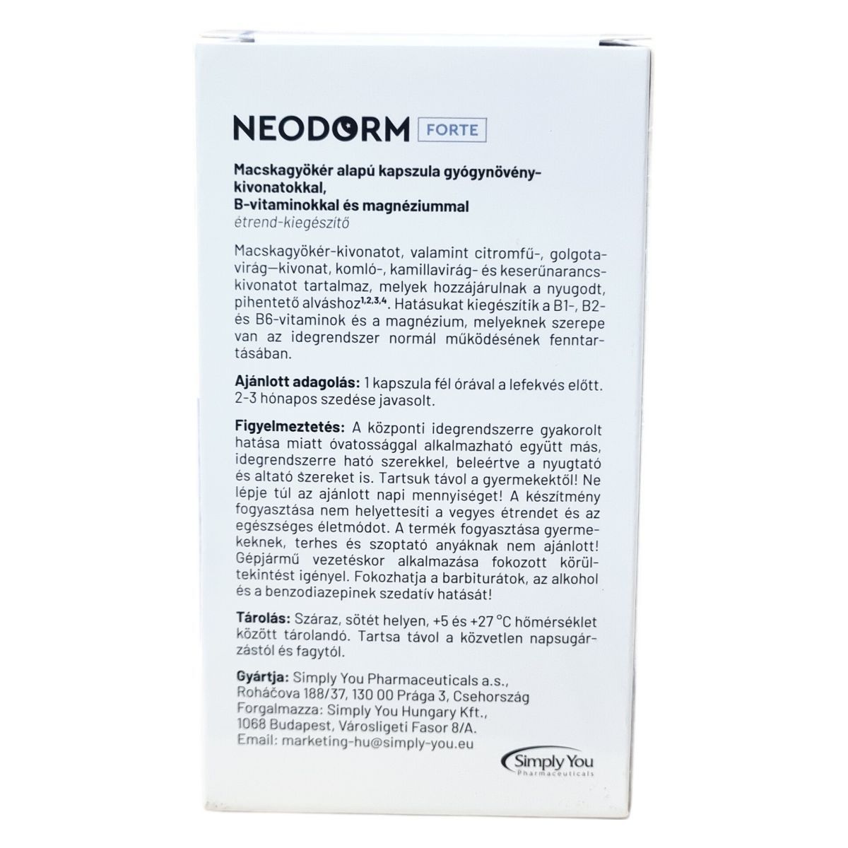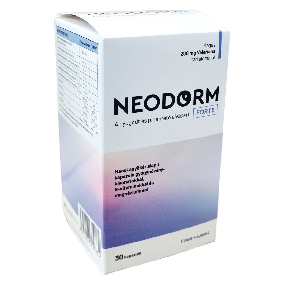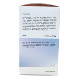 A NEODORM FORTE egy macskagyökér alapú étrend-kiegészítő kapszula, mely többféle gyógynövény-kivonatot, B-vitaminokat és magnéziumot tartalmaz. A készítmény összetevői között szerepel a macskagyökér, citromfű, golgotavirág, komló, kamilla és keserűnarancs kivonata, melyek elősegíthetik a nyugodt és pihentető alvást. A B1-, B2- és B6-vitaminok, valamint a magnézium hozzájárulhatnak az idegrendszer normál működéséhez. A kapszulák mesterséges színezékek nélkül készülnek, természetes színük előfordulhat és nem jelenti minőségi hibát. Fontos, hogy a készítményt ne lépjük túl az ajánlott mennyiségben, és figyeljünk az esetleges kölcsönhatásokra más idegrendszeri készítményekkel. A termék nem helyettesíti a kiegyensúlyozott étrendet és az egészséges életmódot, továbbá nem ajánlott gyermekeknek, terhes és szoptató anyáknak. A használat során ajánlott fokozott óvatosság járművezetéskor.