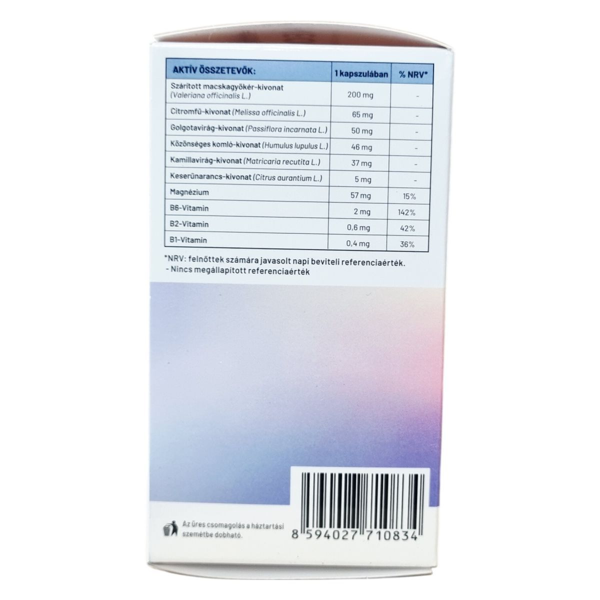 macskagyökér-kivonat, zselatin, magnézium-oxid, citromfű levél-kivonat, golgotavirág virág-kivonat, komló tobozkivonat, kamilla virág-kivonat, maltodextrin, szilícium-dioxid, magnézium-sztearát, keserűnarancs kivonat, kálcium-karbonát, piridoxin-hidroklorid, riboflavin, tiamin-hidroklorid