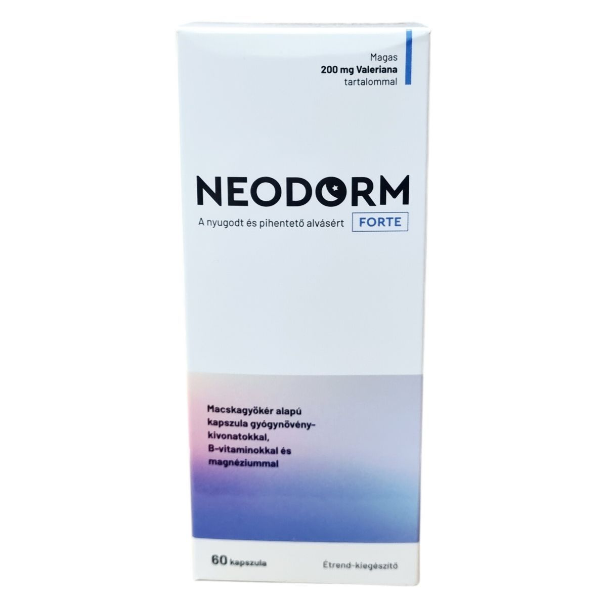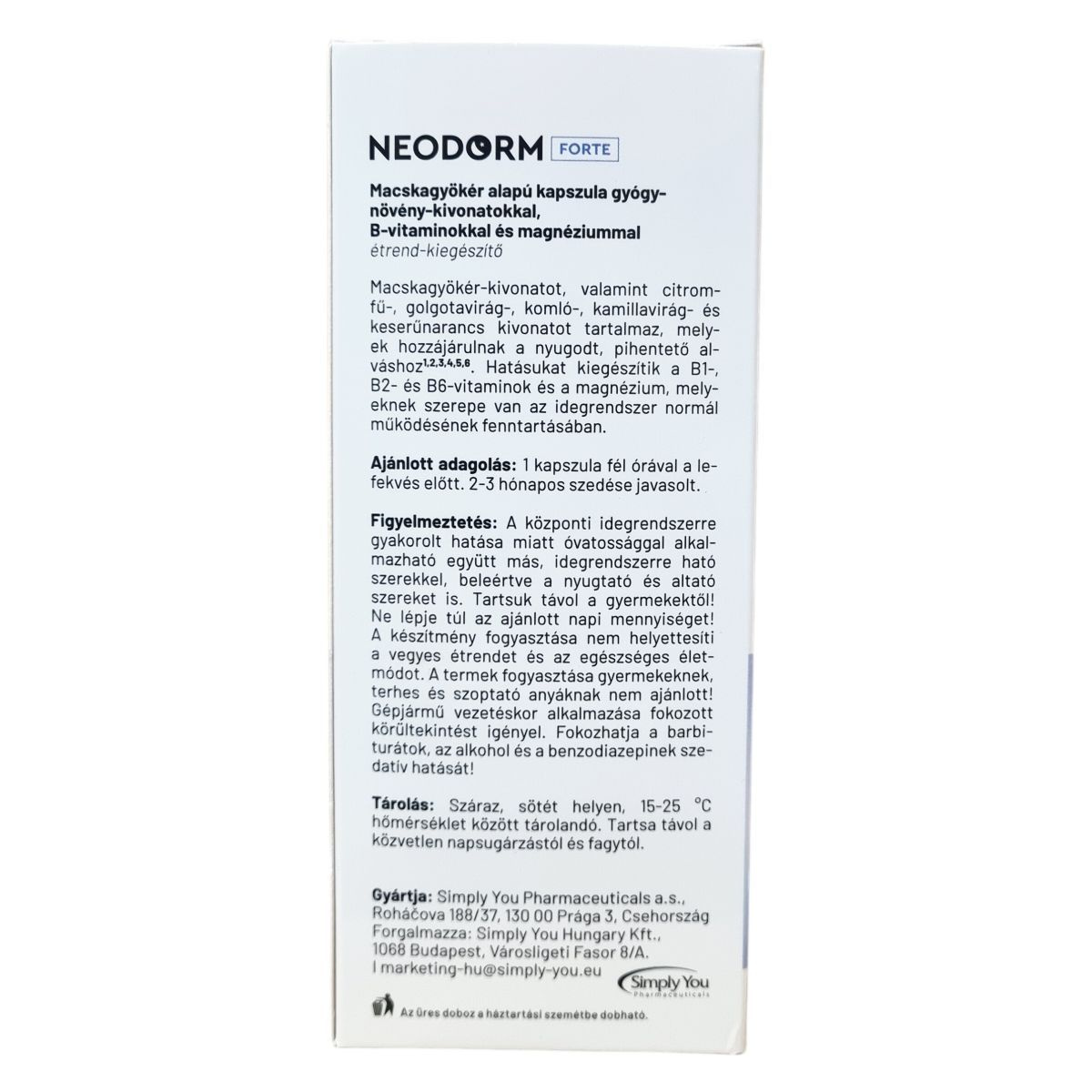 A NEODORM FORTE étrend-kiegészítő macskagyökér alapú kapszula, mely gyógynövény-kivonatokat, B-vitaminokat és magnéziumot tartalmaz. Összetevői között szerepel a macskagyökér, citromfű, golgotavirág, komló, kamillavirág és keserűnarancs kivonata, melyek hozzájárulhatnak a nyugodt, pihentető alváshoz. A B1-, B2- és B6-vitaminok, valamint a magnézium támogatják az idegrendszer normál működését. Az ajánlott adagolás 1 kapszula fél órával lefekvés előtt, javasolt a 2-3 hónapos folyamatos szedés. A készítmény fogyasztása nem helyettesíti a vegyes étrendet és az egészséges életmódot. Óvatosan alkalmazandó más, idegrendszerre ható szerekkel együtt, mert fokozhatja azok hatását. A termék gyermekek, terhes és szoptató anyák számára nem ajánlott. Tárolása során fontos a száraz, sötét hely és a megfelelő hőmérséklet betartása. Az üres doboz a háztartási szemétbe dobható.