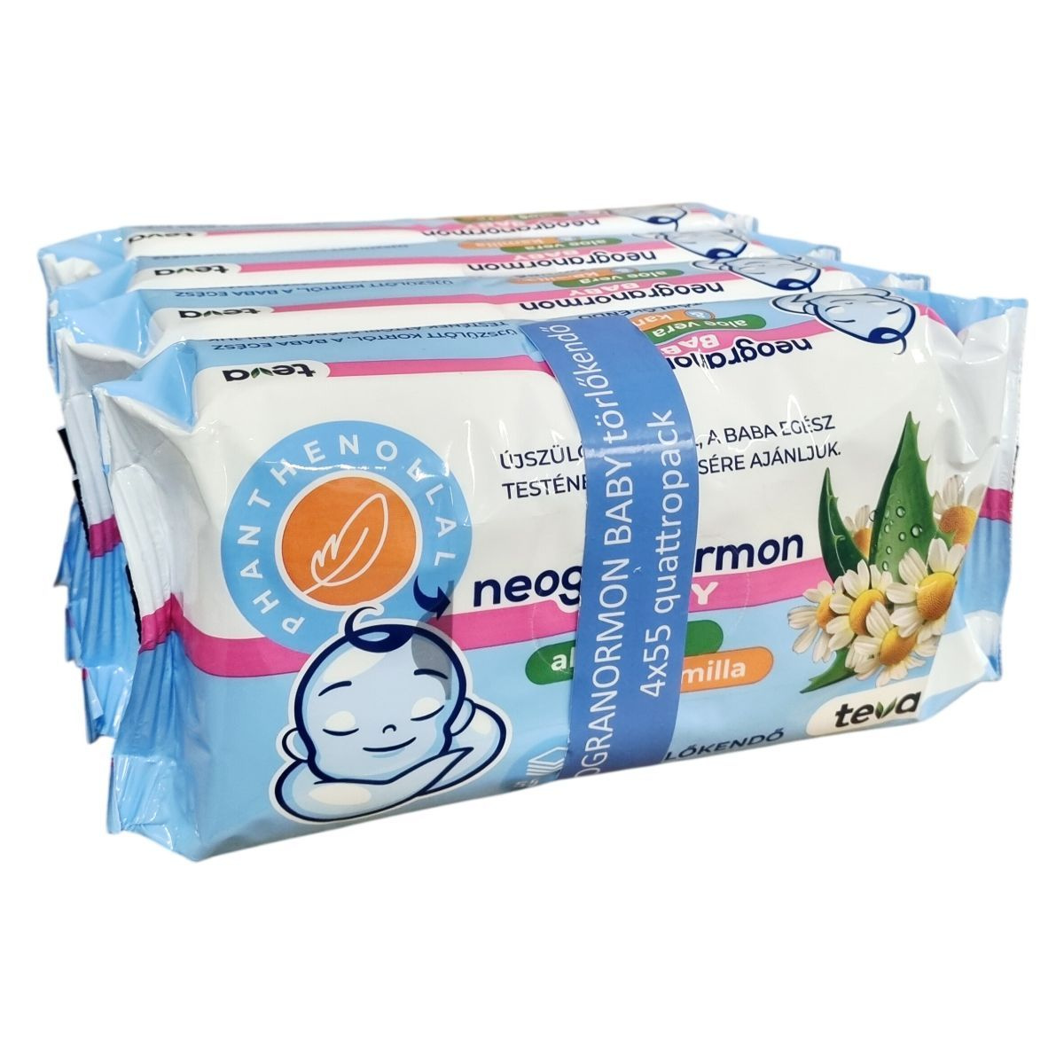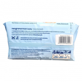 A neogranormon baby törlőkendő aloe vera és kamilla kivonat tartalmának köszönhetően gyengéden ápolja a baba bőrét, bőrsemleges pH-val rendelkezik. Vastag, puha, textilhatású anyaga biztosítja a kíméletes és hatékony tisztítást. A termék műanyagot tartalmaz és újszülött kortól használható a baba egész testének áttörlésére. A gyártási tétel szám és a felhasználhatóság időpontja megtalálható a csomagolás hátoldalán.