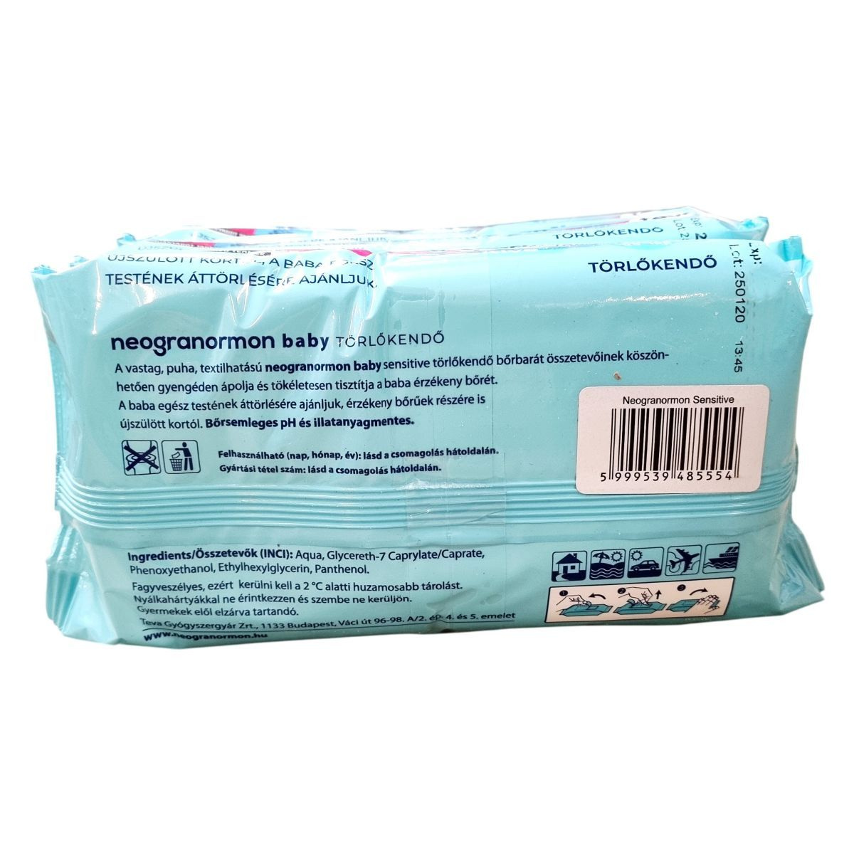 A Neogranormon Baby sensitive törlőkendő vastag, puha és textilhatású, így kellemes érzést biztosít a baba bőrének. A bőrbarát összetevők gyengéden ápolják és tisztítják a legérzékenyebb bőrt is, ezért újszülött kortól használható. A termék 96%-ban vizet tartalmaz, biztosítva a magas tisztaságot és kíméletességet. A gyártási tétel számát és a felhasználhatóság idejét a csomagolás hátoldalán találja a vásárló.