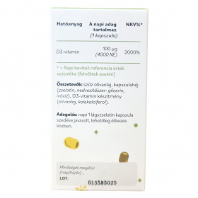 A D3-vitamin (kolekalciferol) egy zsírban oldódó vitamin és prohormon, amely a szervezetben aktív hormonszerű vegyületté alakul. A bőrben UVB-sugárzás hatására képződik, majd a májban és a vesében történő átalakulás után a kalcium- és foszfát-anyagcsere szabályozásában játszik szerepet. Hozzájárulhat a normál csontozat és fogazat fenntartásához, valamint támogathatja az immunrendszer megfelelő működését. Részt vesz a sejtosztódási folyamatok szabályozásában és az izomműködés fenntartásában is. Hiánya csökkent napfény-expozíció vagy elégtelen bevitel esetén alakulhat ki. Megfelelő adagolás mellett biztonságos, ugyanakkor túladagolása hiperkalcémiához vezethet. Egyéni egészségügyi állapot vagy gyógyszerszedés esetén javasolt szakemberrel konzultálni.
