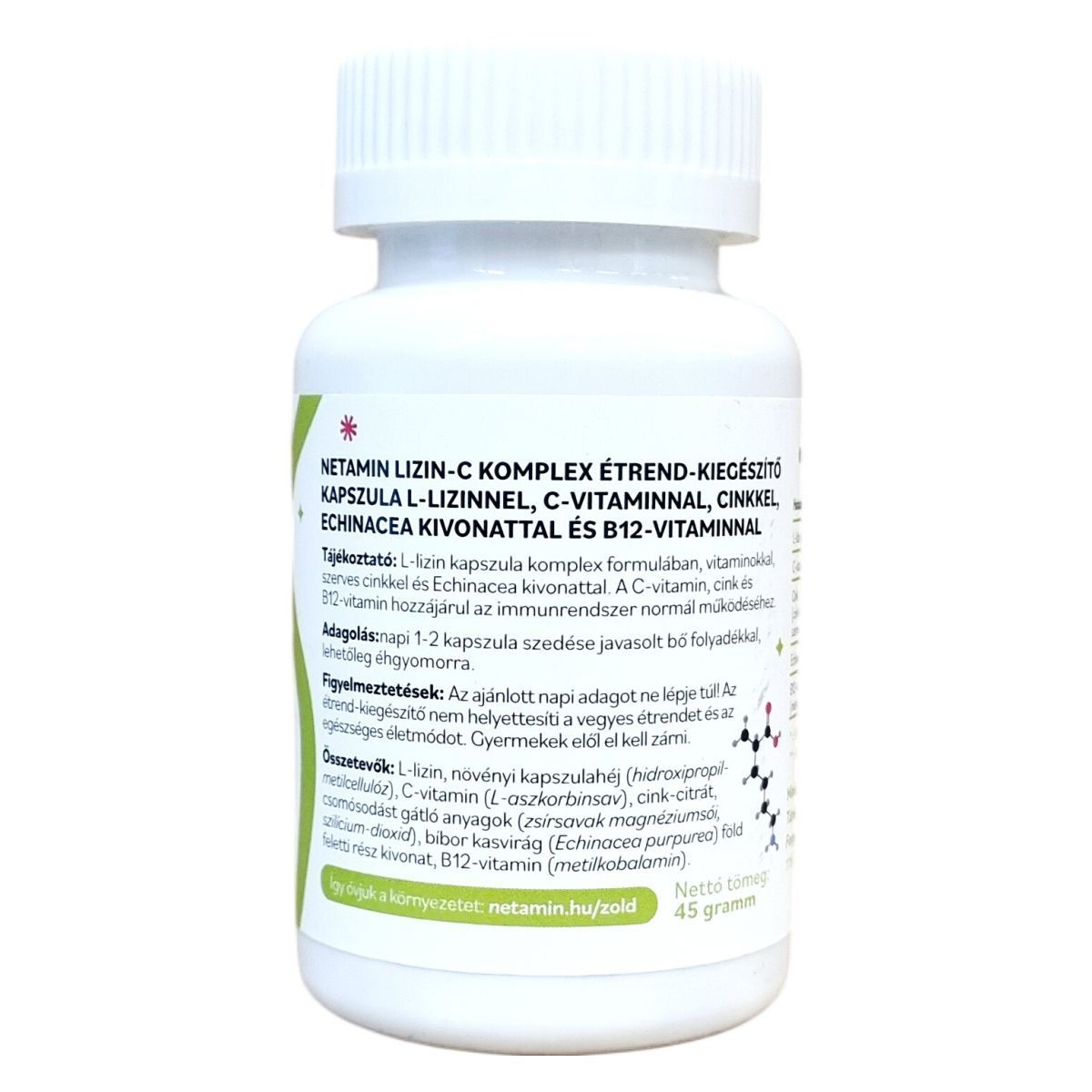 A Netamin Lizin-C Komplex kapszula komplex formulában tartalmaz L-lizint, C-vitamint, szerves cinket, Echinacea kivonatot és B12-vitamint. A C-vitamin, cink és B12-vitamin hozzájárulhat az immunrendszer normál működéséhez. A napi adagonkénti hatóanyag-összetétel pontos mennyiségekben segítheti a szervezet egészségét. A termék vegán, és 60 darab kapszulát tartalmaz egy csomagban. A kapszula növényi alapú, mely hidroxipropil-metilcellulóz héjjal készül. A termék csomósodásgátló anyagokat is tartalmaz a minőség megőrzése érdekében. Az étrend-kiegészítő adagolása napi 1-2 kapszula, melyet javasolt bő folyadékkal, lehetőleg éhgyomorra bevenni. Tárolása száraz, sötét és hűvös helyen ajánlott, hogy megőrizze minőségét és hatékonyságát.