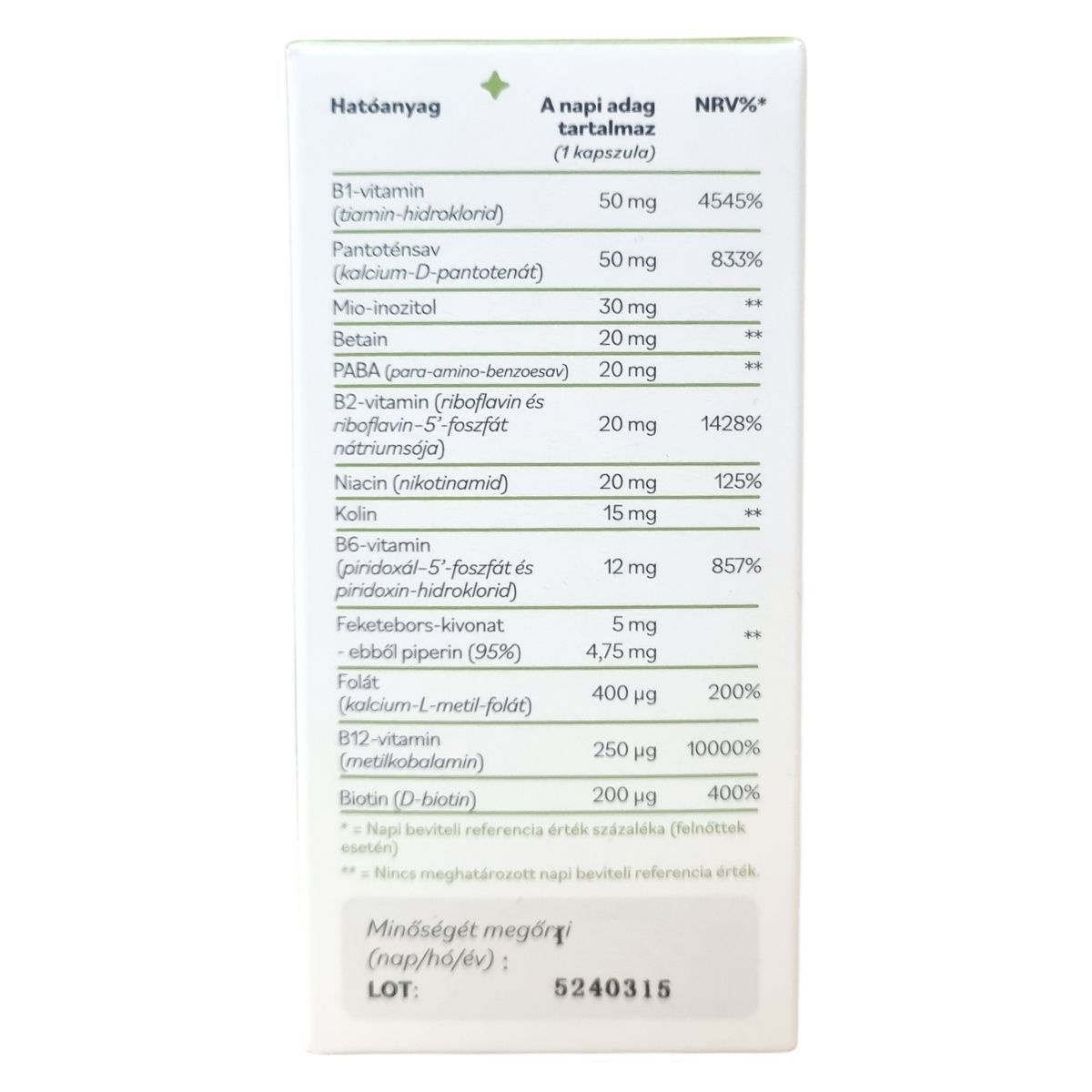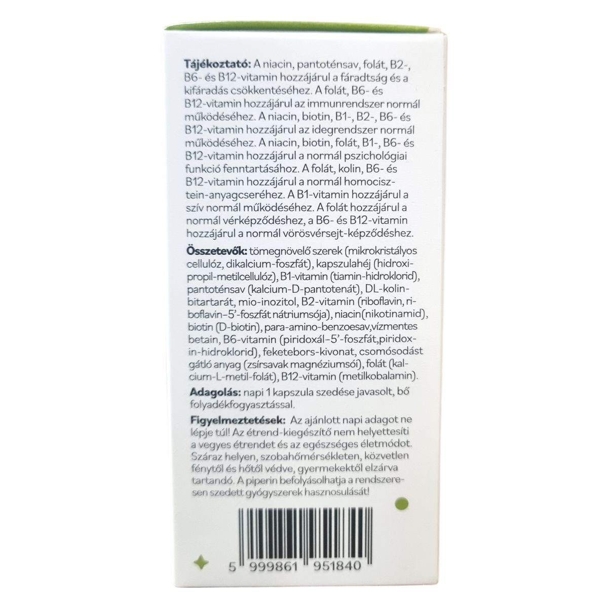 A B-komplex vízoldékony vitaminok csoportját jelenti, amely magában foglalja többek között a B1- (tiamin), B2- (riboflavin), B3- (niacin), B5- (pantoténsav), B6- (piridoxin), B7- (biotin), B9- (folát) és B12-vitamint (kobalamin). Ezek a mikrotápanyagok koenzimként vesznek részt a sejtszintű energiatermelésben, a szénhidrát-, zsír- és fehérje-anyagcserében, valamint az idegrendszer működésében és a vérképzésben. A B-vitaminok egymással szinergiában működnek, ezért kombinált bevitelük támogathatja az anyagcsere-folyamatok összehangolt működését. Vízoldékonyságuk miatt rendszeres pótlásuk indokolt lehet hiányos étrend vagy fokozott szükséglet esetén. A biztonságosság általában kedvező, de egyes komponensek nagy dózisban mellékhatásokat okozhatnak. Egyéni egészségügyi állapot vagy gyógyszerszedés esetén javasolt szakemberrel konzultálni.