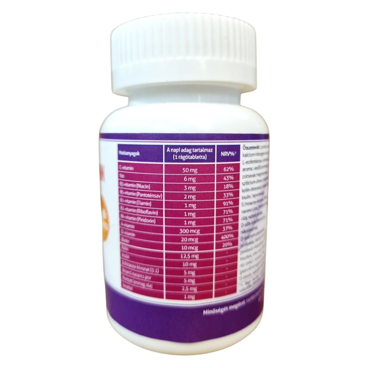 szorbitol, cukor, kalcium-hidrogén-foszfát, L-aszkorbinsav, vörösszőlő aroma, vas(III)-pirofoszfát, zsírsavak magnézium sói, szilícium-dioxid, maltodextrin, kolin-bitartarát, kolekalciferol, inulin, hipromellóz, Echinacea-kivonat, Keserű narancs por, Porított lenmag olaj, retinil-acetát, D-alfa-tokoferil-acetát, nikotinamid, D kalcium-pantotenát, szukralóz, tiamin-mononitrát, piridoxin-hidroklorid, riboflavin, inozitol, cink-oxid, kálium-jodid, fehér viasz, L-tartarát, folsav (pteroilmonoglutaminsav), D-biotin, kalcium-foszfát.
