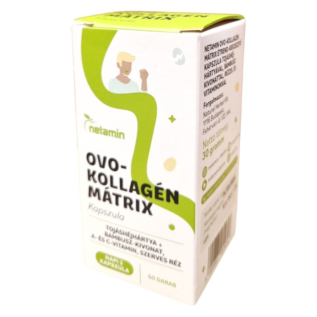 A Netamin OVO-KOLLAGÉN MÁTRIX kapszula egy speciális étrend-kiegészítő, amely tojáshéjhártya-por, bambusz-kivonat, A- és C-vitamin, valamint szerves réz kombinációját tartalmazza. Az A-vitamin hozzájárulhat a bőr normál állapotának fenntartásához, míg a C-vitamin támogathatja a normál kollagénképződést, ami fontos lehet a bőr, porcok és csontozat egészsége szempontjából. A réz részt vehet a kötőszövetek normál állapotának fenntartásában. A termék napi adagja 2 kapszula, amelyet bő folyadékkal, lehetőleg étkezés közben ajánlott bevenni. A termék forgalmazója a Natural Herbal Kft., és a kapszulák 60 darabos kiszerelésben kaphatók.