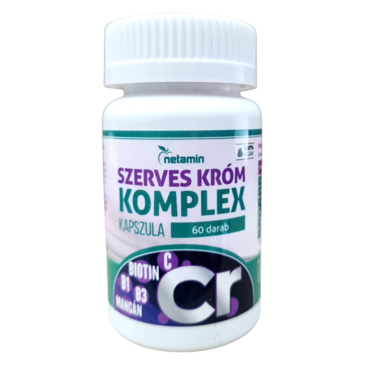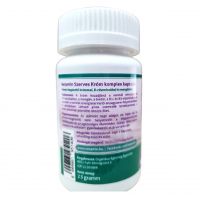 A Netamin Szerves Króm komplex kapszula egy étrend-kiegészítő, amely krómot, B-vitaminokat és mangánt tartalmaz. A króm hozzájárulhat a normál vércukorszint fenntartásához, míg a mangán, a biotin, a B1- és B3-vitaminok részt vehetnek a normál energiatermelő anyagcsere-folyamatokban. A kapszulákban látható piros szemcsék természetesek, a króm-pikolinát jelenléte okozza őket. A termék bio étrendi irányzatba illeszkedik, és fontos, hogy az ajánlott napi adagot ne lépjük túl. A termék nem helyettesíti a kiegyensúlyozott étrendet és az egészséges életmódot.