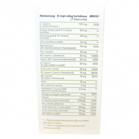 tömegnövelő szer (mikrokristályos cellulóz), növényi kapszulahéj (hidroxipropil-metilcellulóz), C-vitamin (L-aszkorbinsav), cink-citrát, ginkgo biloba levél kivonat, E-vitamin (D-alfa-tokoferil-acetát), D-vitamin (kolekalciferol), ginzeng gyökér kivonat (Panax ginseng), bór (nátrium-borát), kolin (kolin-dihidrogén-citrát), pantoténsav (kalcium-D-pantotenát), citrus bioflavonoidok, mio-inozitol, niacin (nikotinamid), B2-vitamin (riboflavin), B1-vitamin (tiamin-hidroklorid), mangán-glükonát, B6-vitamin (piridoxin-hidroklorid), A-vitamin (retinil-palmitát), likopin, csomósodást gátló anyag (zsírsavak magnézium sói), réz(II)-glükonát, K2-vitamin (menakinon-7), feketebors-kivonat (Piper nigrum), króm(III)-pikolinát, K1-vitamin (fillokinon), folát (kalcium-L-metil-folát), jód (kálium-jodid), molibdén (nátrium-molibdát), B12-vitamin (metilkobalamin), biotin (D-biotin).